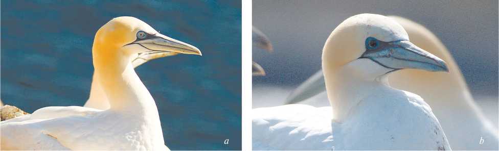 Рис. 1. Радужина глаза северной олуши (Morus bassanus): а – неинфицированная птица; b – птица, переболевшая птичьим гриппом HPAIV (фото А. В. Ежова).