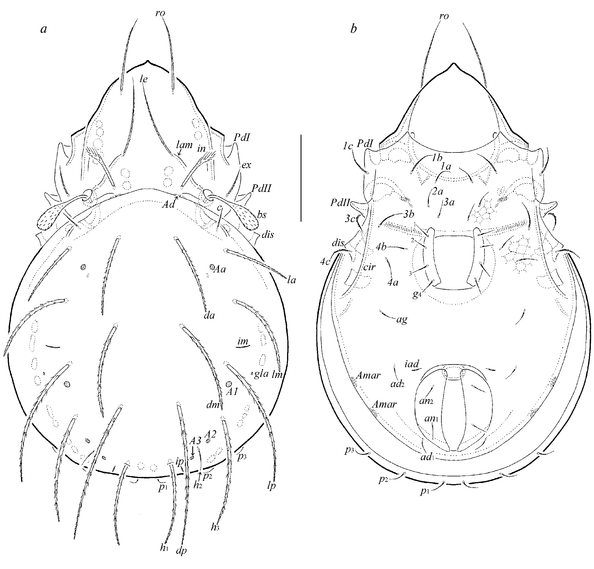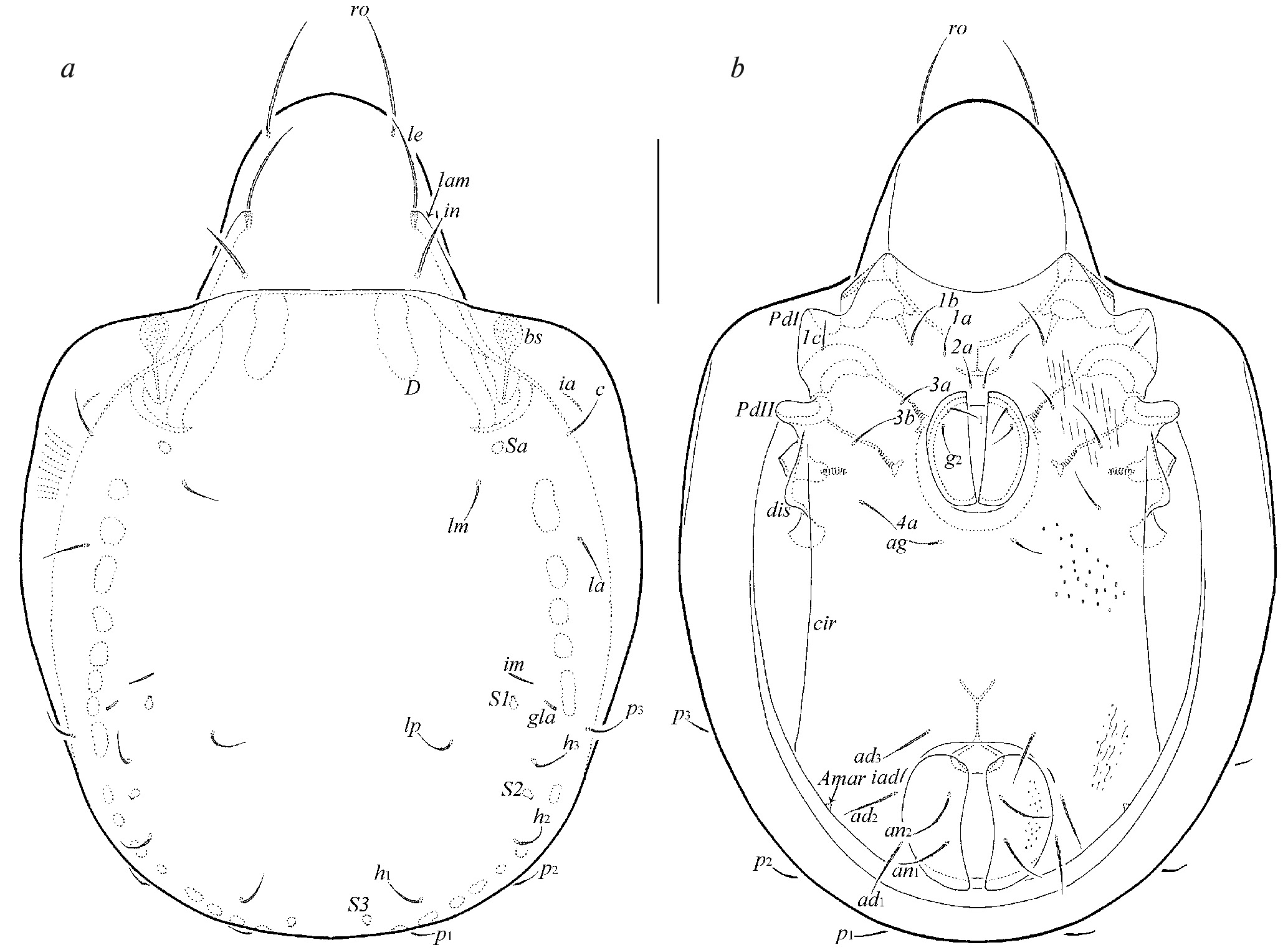 Рис. 1. Phauloppia differens sp. n., adult: a – dorsal view (legs not shown), b – ventral view (gnathosoma and legs not shown). Scale bar 50 µm.