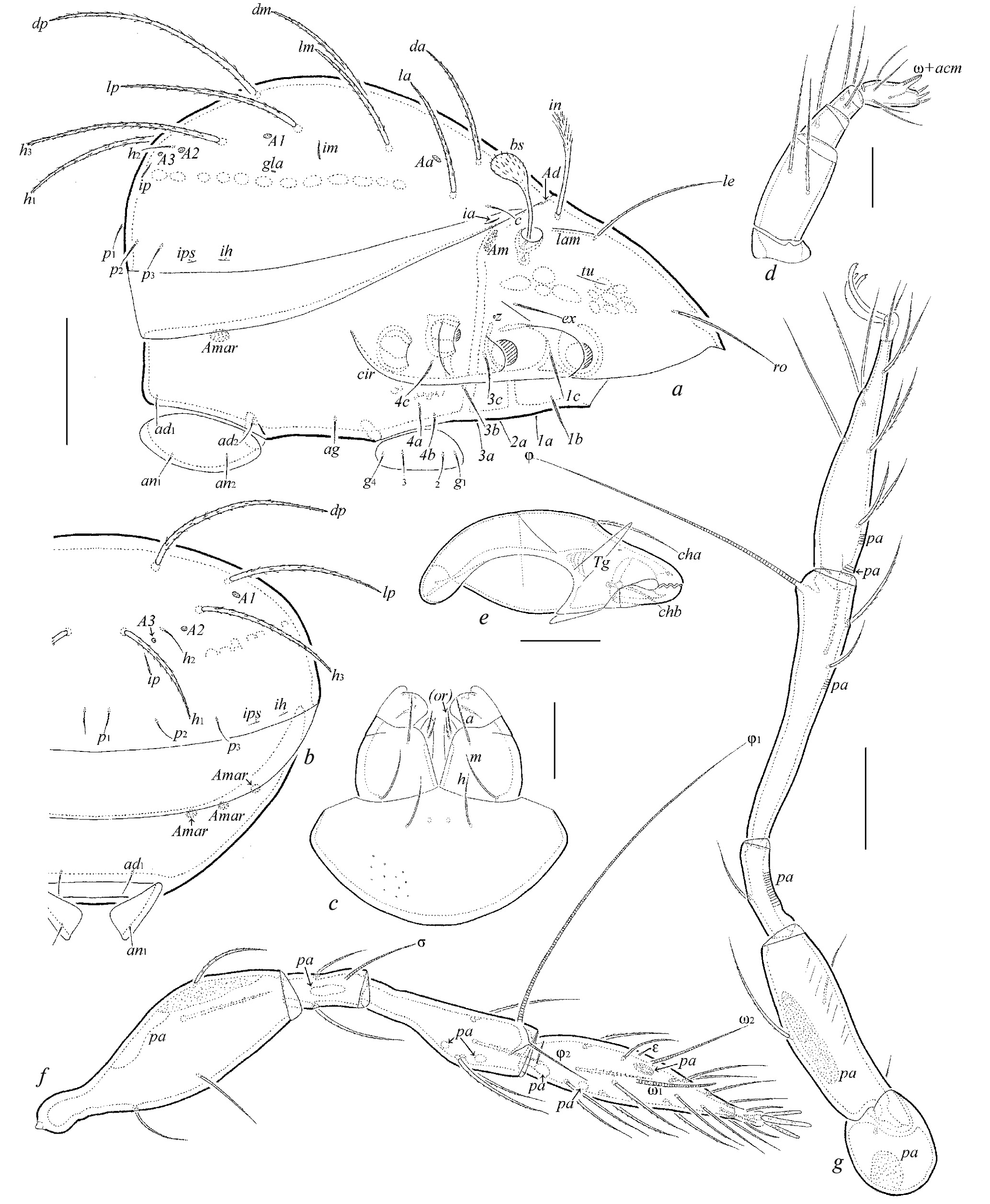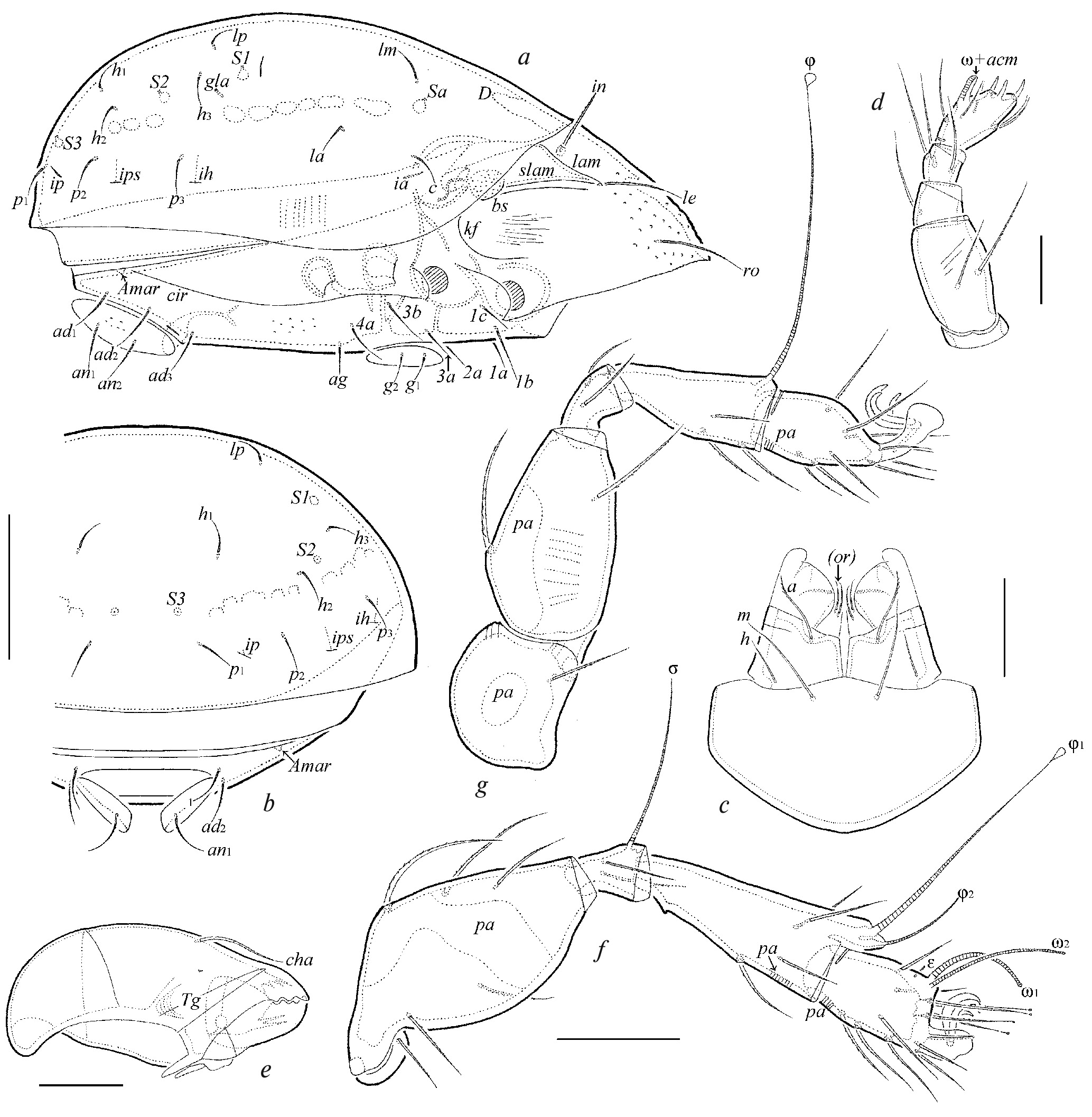 Abbreviations and notations. Prodorsum: lam = lamella; slam = sublamella; tlam = translamella; tu = tutorium; kf = keel-shaped ridge; ro, le, in, ex, bs = rostral, lamellar, interlamellar, exobothridial, bothridial setae, respectively; Ad = dorsosejugal porose area; D = dorsophragma. Notogaster: c, da, la, dm, lm, dp, lp, h, p = setae; Aa, A1, A2, A3 = porose areas; Sa, S1, S2, S3 = sacculi; ia, im, ip, ih, ips = lyrifissures; gla = opisthonotal gland opening. Gnathosoma: a, m, h = subcapitular setae; or = adoral seta; acm = palp seta; ω = palp solenidion; cha, chb = cheliceral setae; Tg = Trägårdh’s organ. Epimeral and lateral podosomal regions: 1a, 1b, 1c, 2a, 3a, 3b, 3c, 4a, 4b, 4c = epimeral setae; z = aperture of supracoxal gland; Am = humeral porose area; PdI, PdII = pedotecta I, II, respectively; dis = discidium; cir = circumpedal carina. Anogenital region: g, ag, an, ad = genital, aggenital, anal, adanal setae, respectively; iad = adanal lyrifissure; Amar = marginal porose area. Legs: Tr, Fe, Ge, Ti, Ta = trochanter, femur, genu, tibia, tarsus, respectively; pa = porose area; e = famulus; d, l, v, ev, bv, ft, tc, it, p, u, a, s, pv, pl = setae; ω, σ, j = solenidia.