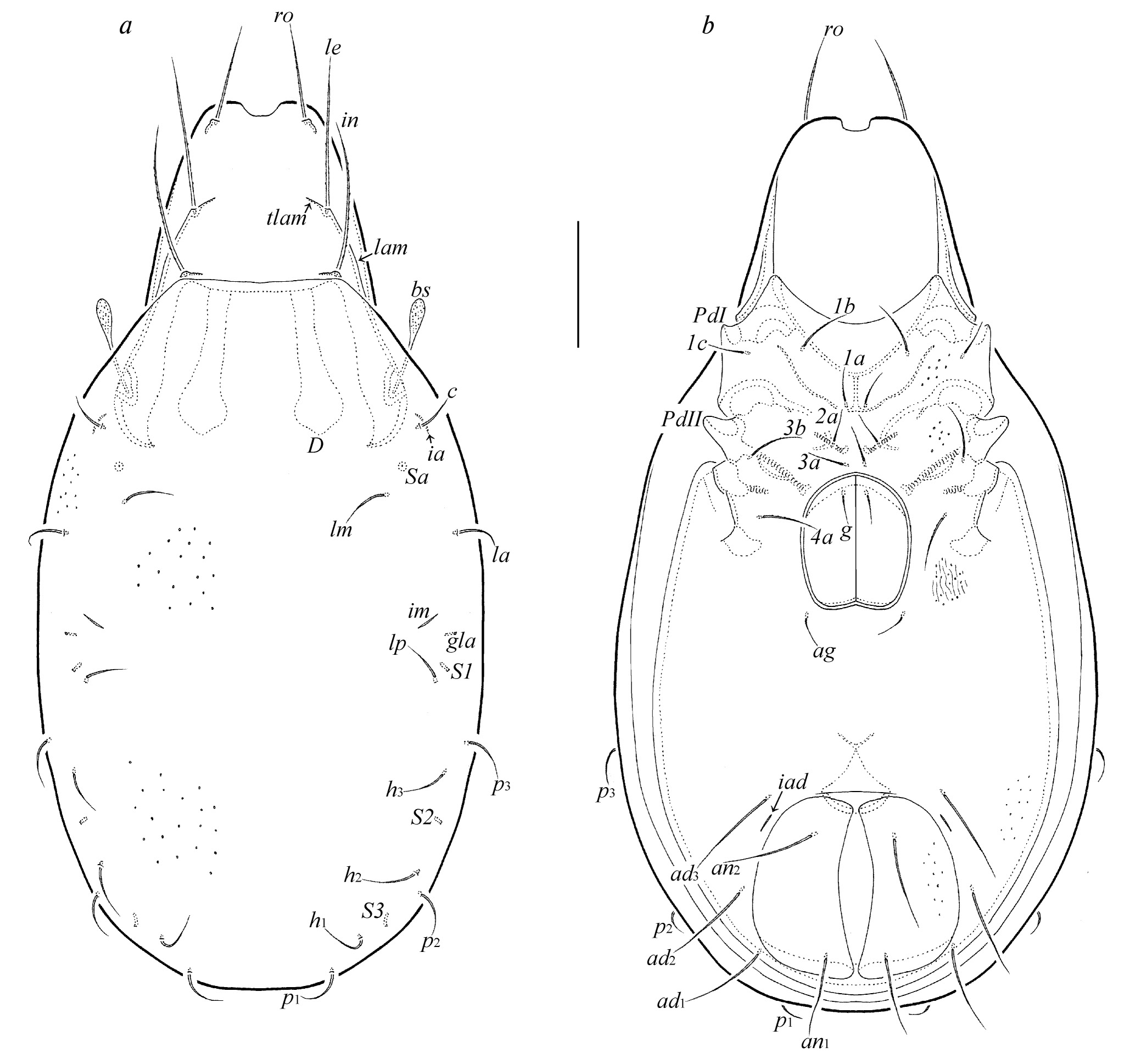 Fig. 5. Pirnodus concavus sp. n., adult: a – dorsal view (legs not shown), b – ventral view (gnathosoma and legs not shown). Scale bar 50 µm.