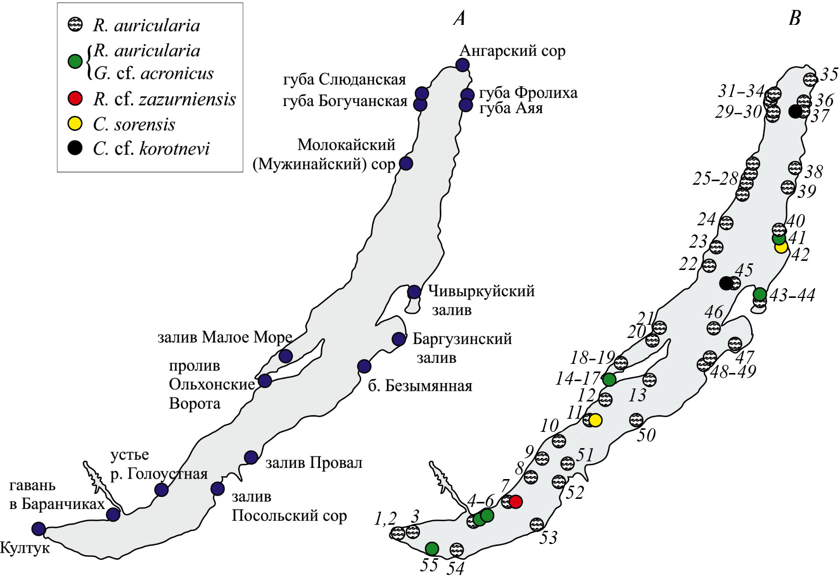 Именно эти сведения (рис. 1А) послужили основой для выявления изменений, произошедших в современных таксоценозах байкальских гастропод, приуроченных к открытому Байкалу.
