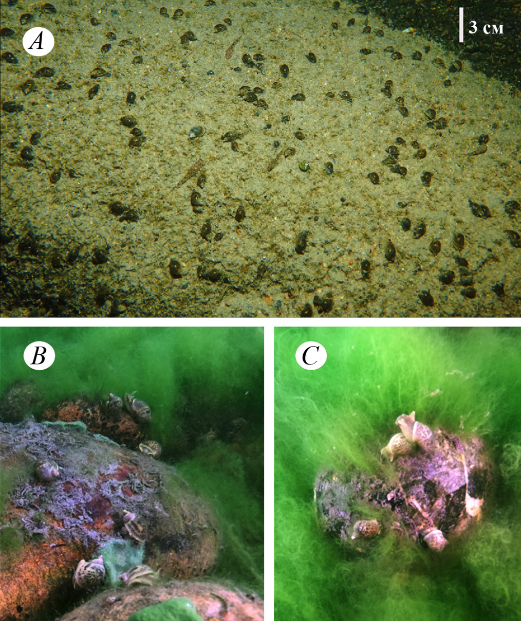 4. Fig. 3. Settlements of R. auricularia on the sandy bottom and single stones in the open littoral at depths of 4-6 m: A – Davsha Bay (October 2017, fig. 1B, station 40, photo by I.V. Khanaev), B– From the village. Zarechnoye (September 2023, fig. 1B, station 34, photo by A.P. Fedotov).