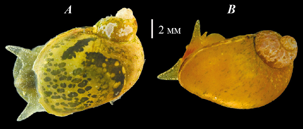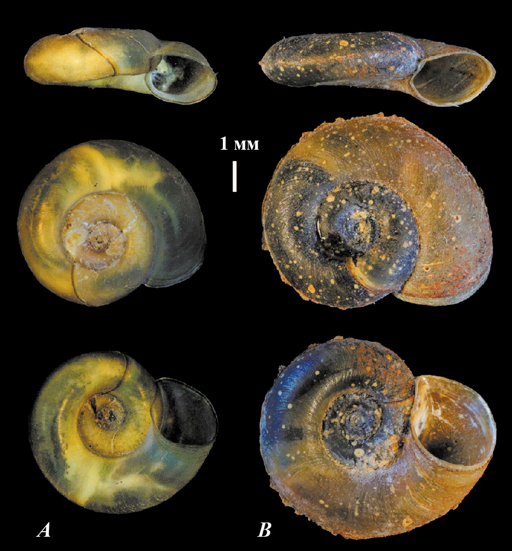8. Fig. 7. Representatives of the genus Gyraulus: A – G. cf. acronicus from the rocky soil on the edge of Cape Valukan (Fig. 1B, station 41), B – G. cf. stroemi from the Molokai (Muzhinai) litter.