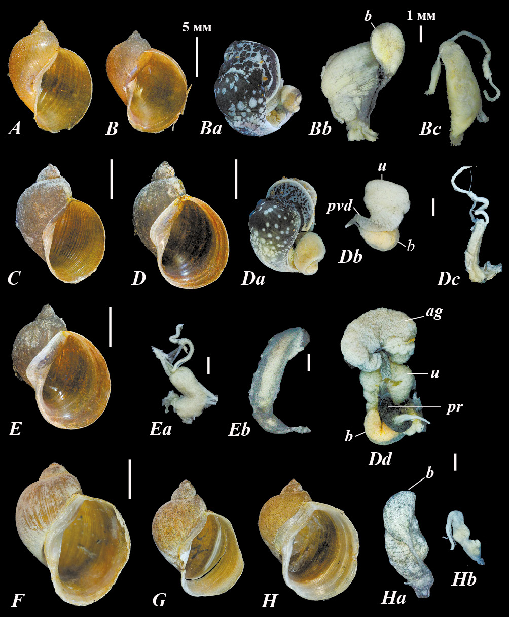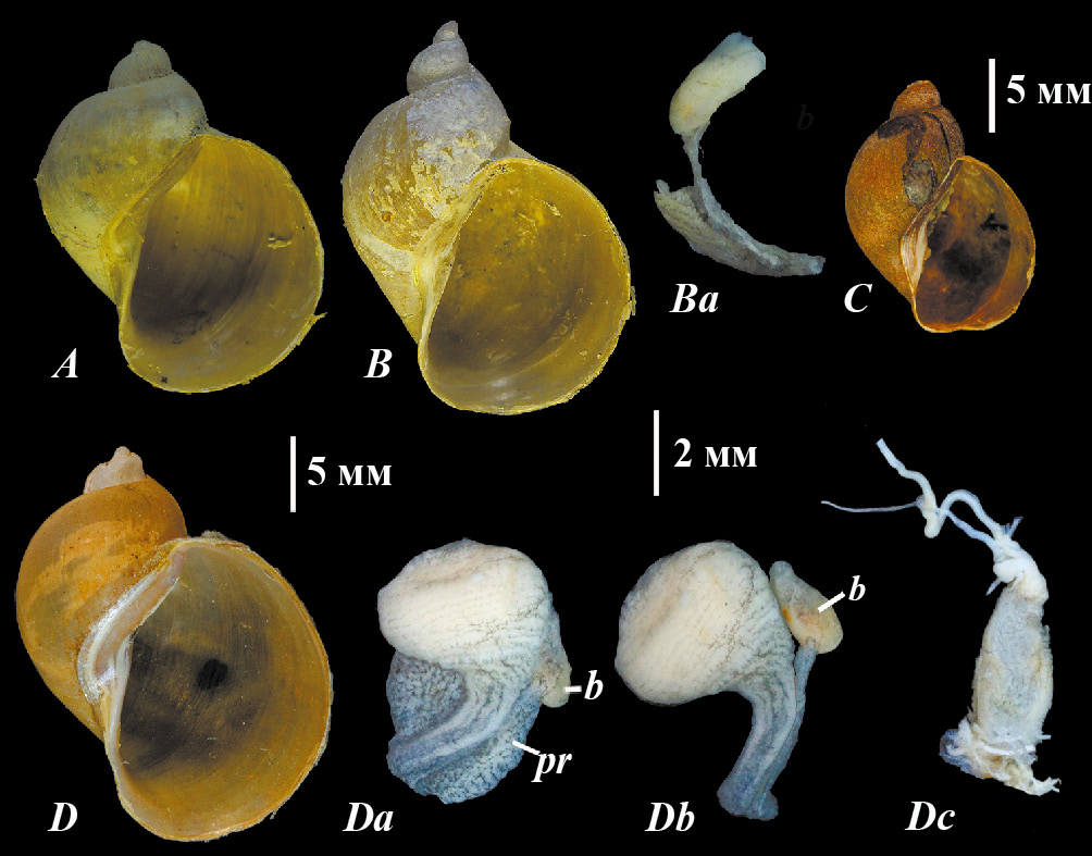 7. Fig. 6. Shells and genitals of Radix spp. from the littoral of open Lake Baikal near the Molokai (Muzhinai) litter (A, B) and directly from the litter (C, D). A – R. auricularia (July 2006), B – R. auricularia (July 2003), C – R. ovata petricola? (= R. balthica?) (July 2019), D – R. cf. auricularia (June 2021). Ba – bursa, Da – pallial genitalia dorsally, Db – the same without prostate, Dc – copulatory organ; b – bursa, pr – prostate.
