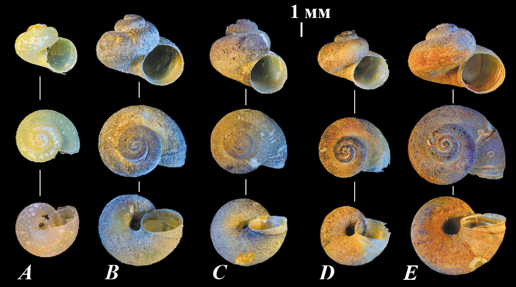 9. 8. Valvat shells from various areas of Lake Baikal: A – C. sorensis from Sosnovka Bay (Fig. 1B, station 42), B – C. sorensis from the estuary section of the Anga River (Fig. 1B, station 11); C – C. sorensis from the Embassy litter (Fig. 1A); D – Cincinna sp. from the estuary section of the Goloustnaya river (Fig. 1B, station 7); E – C. cf. korotnevi from b. Aaya (fig. 1B, station 37).