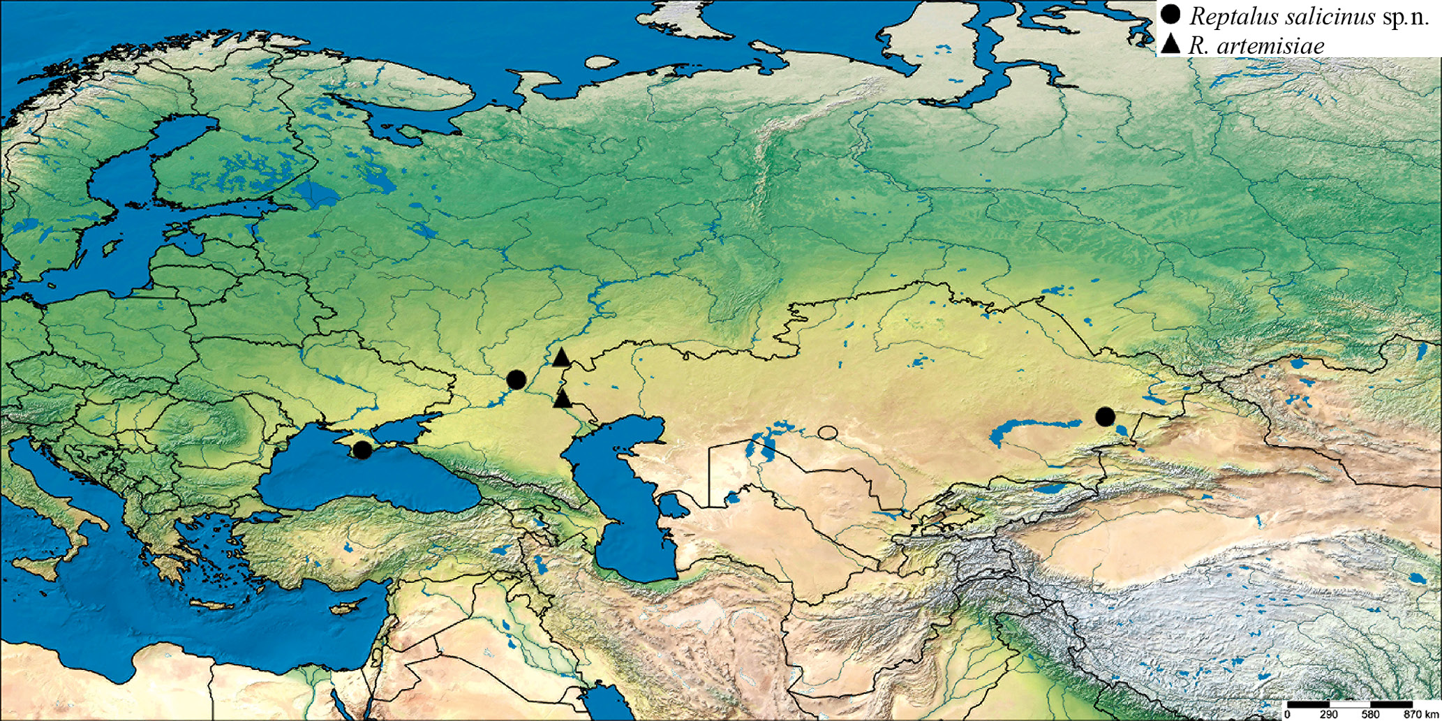 Remarks. We failed to find morphological traits for distinguishing between R. salicinus sp. n. and R. artemisiae. However, since these species are associated with different plants that differ distinctly in biotopic preferences, it is sufficient to have data on the biotope and sometimes only on the locality, to identify a species.