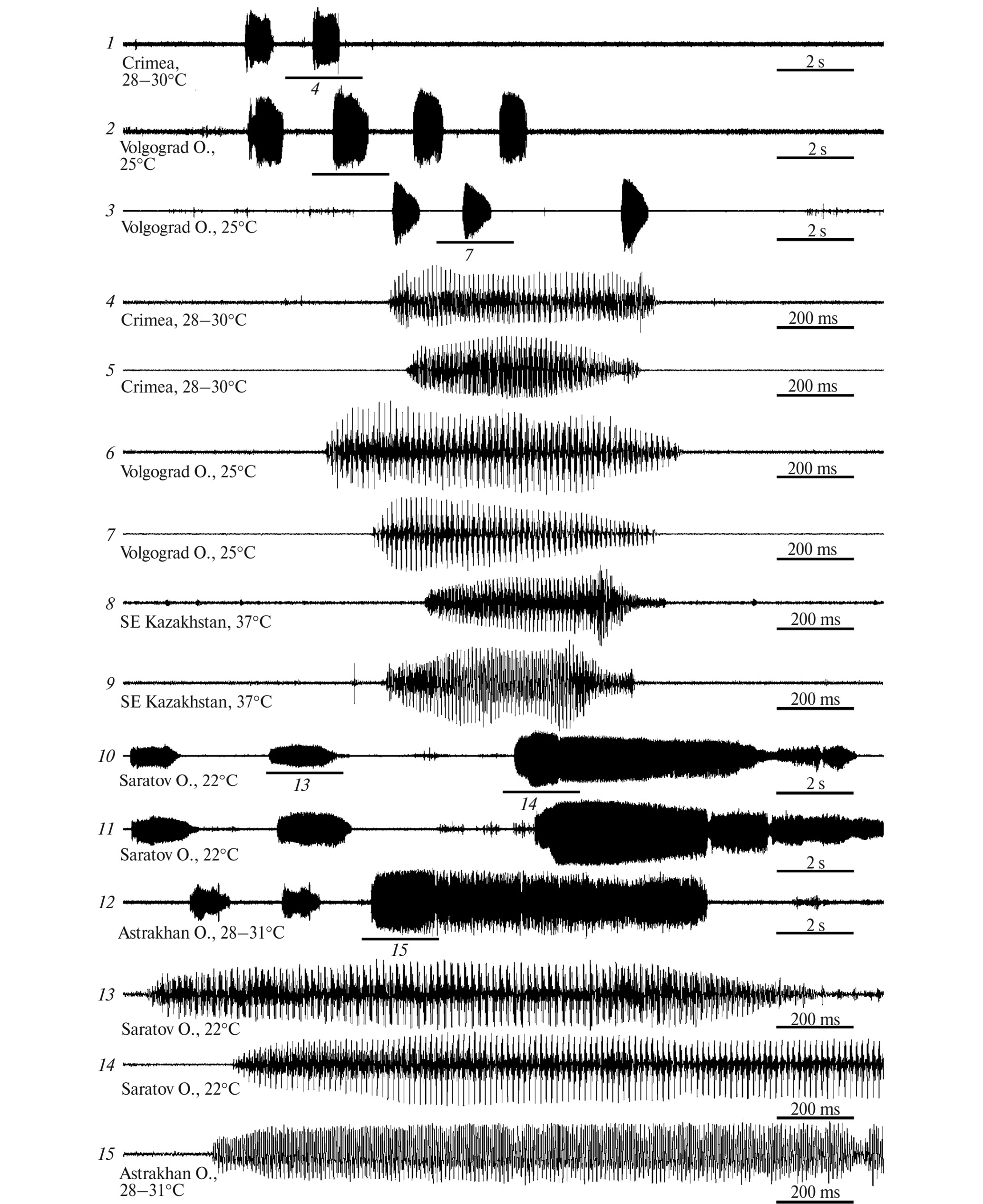 In R. artemisiae, male calling signal is a phrase las- ting for about 12–20 s and normally consisting of two shorter syllables followed by one longer syllable (fig. 4, 10–15). The duration of shorter syllables averages 1– 2 s, the duration of the longer syllable is 9–12 s. Pulse repetition rate in syllables is almost the same as in R. salicinus sp. n. and averages 60–70 pulses per second at 22оC and 70–90 pulses per second at 30–31оC. Occasionally, the male produces single shorter syllables lasting for 2–5 s.