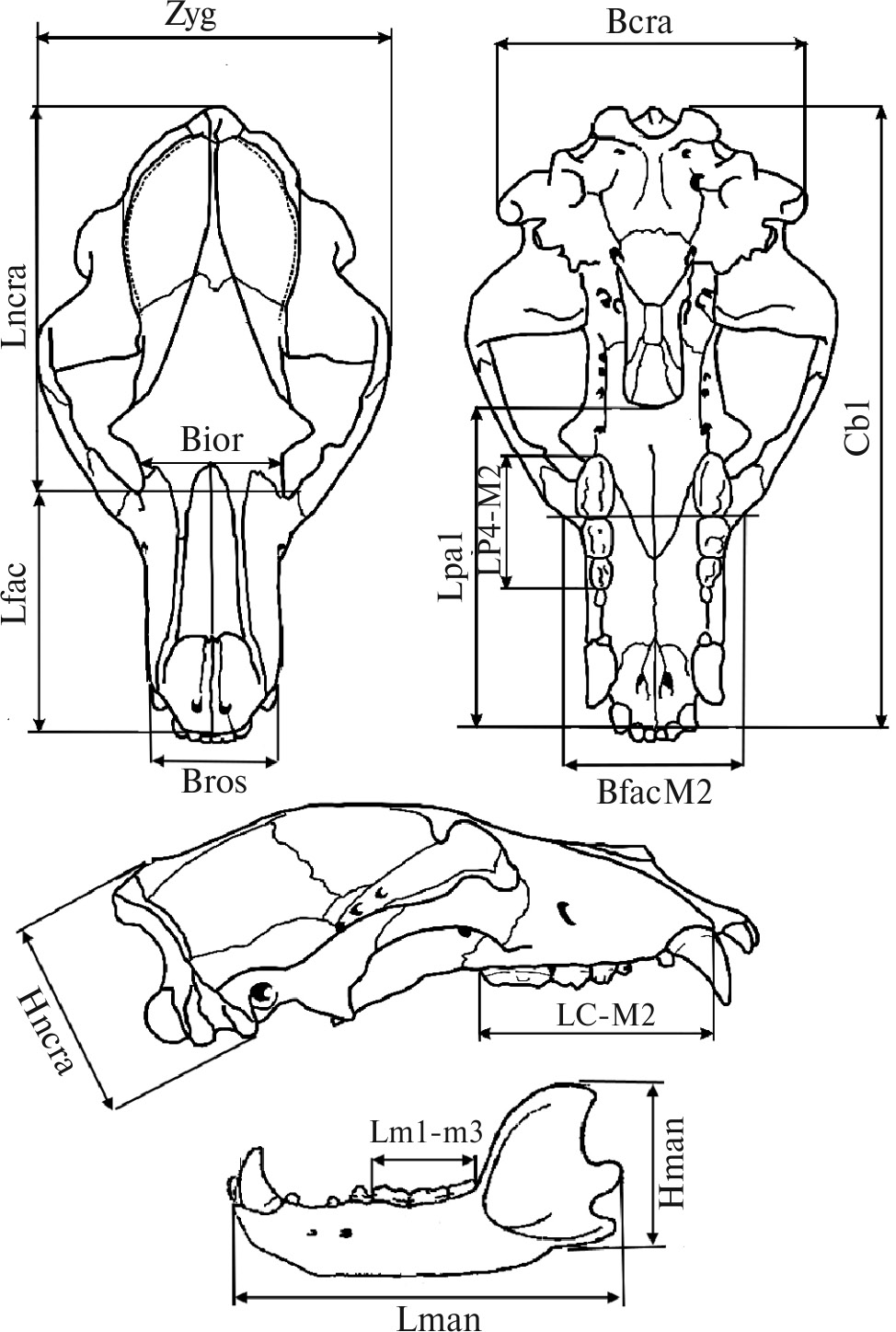 3. Fig. 2. The scheme of measurements of the skull of a brown bear. Descriptions of measurements are given in the text. The measurements of the length and width of teeth 18-21 missing in the figure are taken from the buccal side (length) and in the widest part of the tooth (width). The scheme of measurements of cheek teeth of bears is given in Baryshnikov's monograph (2007, fig. 3).