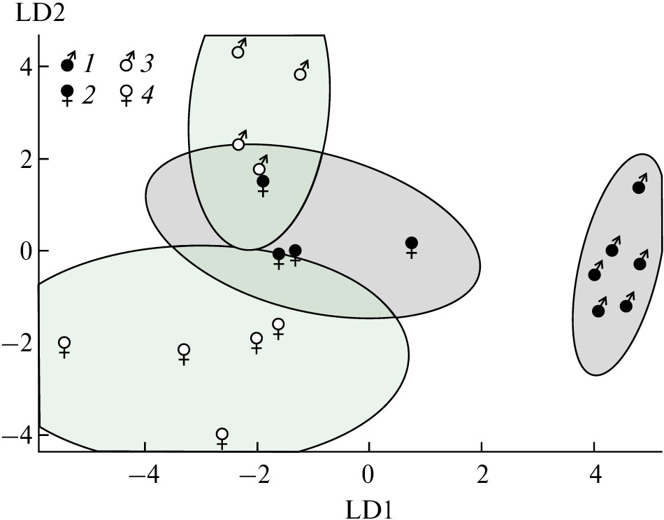 Вдоль первой канонической оси (LD1) обособилась группа самцов, которую мы обозначили как I-♂. Вдоль второй канонической оси (LD2) обособились три группы: группа самцов (II-♂) и две группы самок (I-♀ и II-♀), при этом эффективность дискриминации составила 100%.