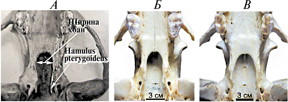 5. Fig. 4. The shape of the posterior choanae in brown bears (Ursus arctos L.). A – Tien Shan, ZIN 1235 ♂, coll. N.M. Przhevalsky; B - Northern Tibet, Tsaidam (Fig. 1, 3), ZIN 3214 ♂, coll. N.M. Przhevalsky (population-I); In the upper reaches of the Yellow River, Tolichu River (Fig. 1, 9 ), ZIN 7818 ♂, coll. P.K. Kozlov (population-II ).
