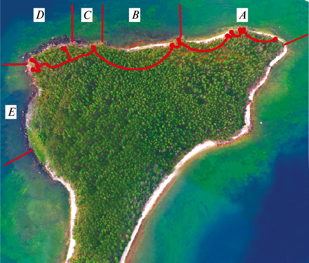 Рис. 1. Маршрут пеших учетов, проложенный по северному побережью о-ве Тонкий. A–E – сектора, в которых животных подсчитывали преимущественно с одной точки наблюдения. Животных в каждом секторе учитывали отдельно.