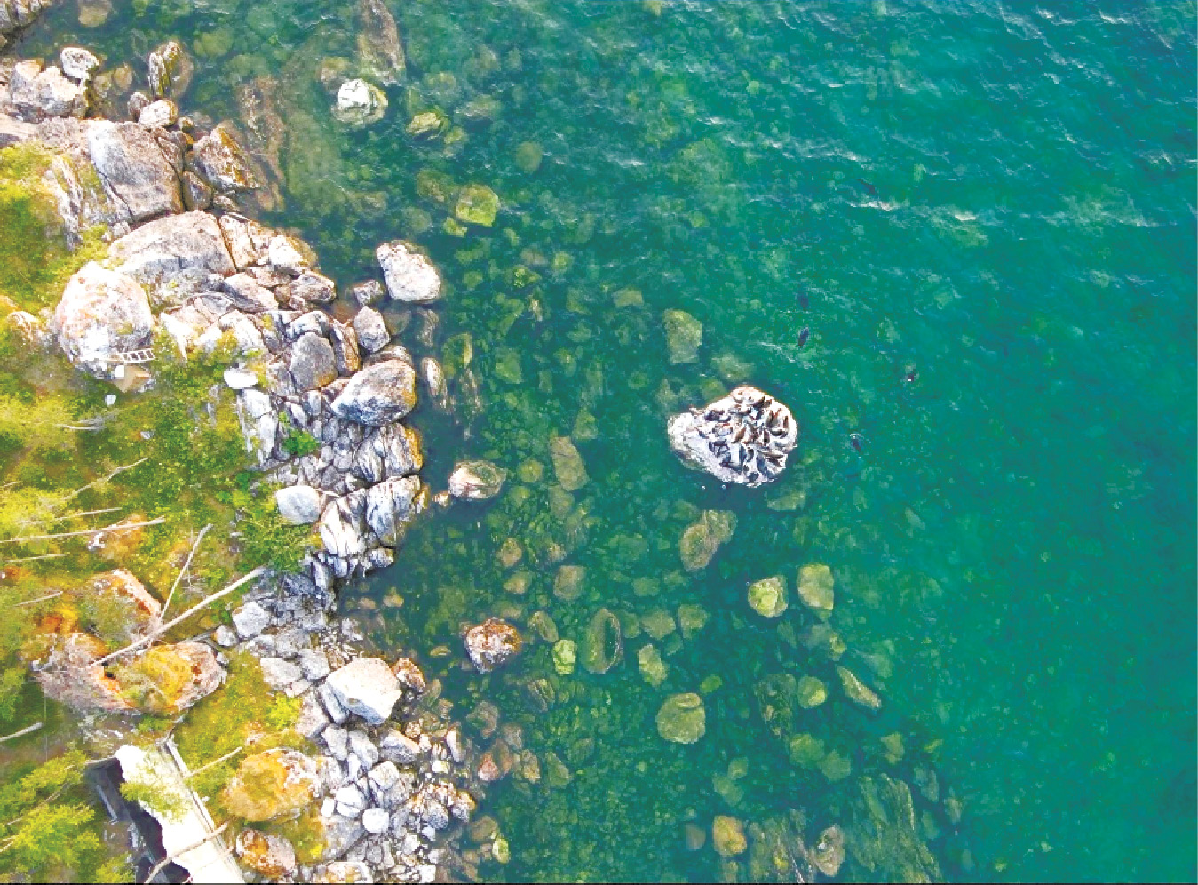 Рис. 2. Фрагмент видеозаписи с БПЛА. Тюлени видны как в воде, так и на суше. Высота съемки – около 50 м.