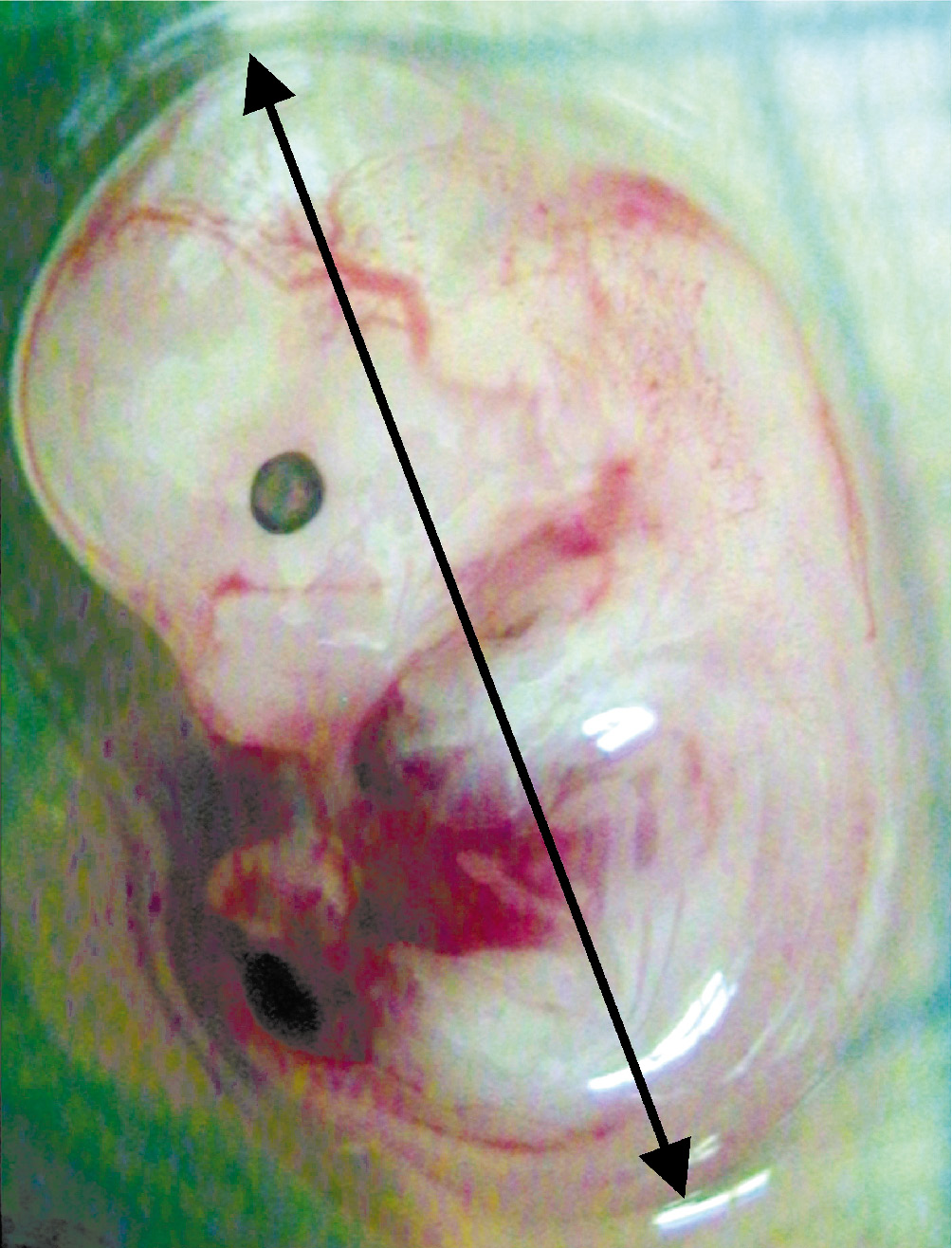Эвтаназию проводили путем декапитации. Извлечение эмбрионов из матки на ранней постимплантационной стадии развития выполняли по методике (Udan, Dickinson, 2010). Для описания морфологических признаков использованы 147 эмбрионов от 26 самок на 8–19-й день беременности и 13 эмбрионов от двух самок на 6-й или 7-й день беременности. Также было исследовано 5 самок без видимых мест имплантации на 4–5-й день беременности. С помощью шприца, заполненного средой 199, промывали рога матки под микроскопом МБС-10 (×28) и определяли наличие доимплантационных эмбрионов. У самок оценивали число желтых тел беременности, мест имплантации и число живых эмбрионов. Массу и длину эмбрионов оценивали, начиная с 8-го дня беременности. Измерение массы (n = 114) и длины эмбрионов (n = 117) проведено у 21 и 23 беременных самок соответственно. Для определения массы эмбрионов использовали весы VIBRA серии HT.HTR (наименьший предел взвешивания 0.01 г, точность измерения 0.001 г). Длину эмбрионов измеряли от темени до низа туловища (рис. 1), используя программное обеспечение к цифровой камере к микроскопу Watec.