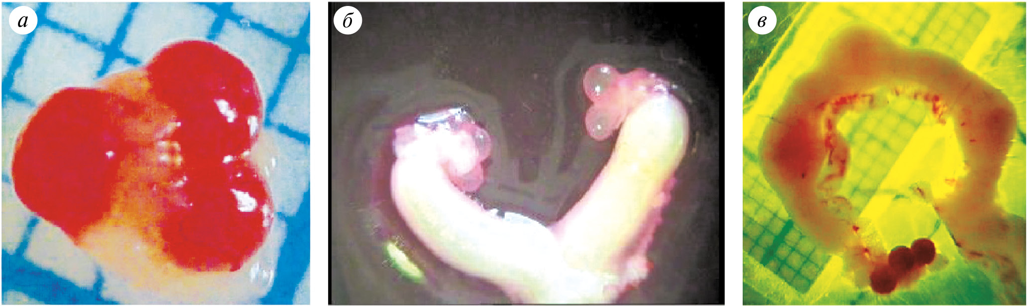 Рис. 2. Желтые тела беременности (а), матка на 4-й день беременности (б), матка на 6-й день беременности (в).
