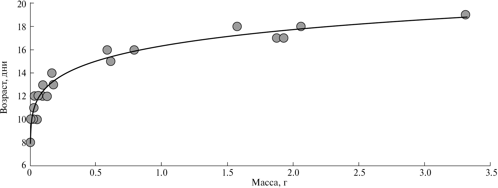 Между средней массой эмбрионов (г) и их возрастом (дни) обнаружена криволинейная зависимость (R2 = 0.9526), наиболее точно описываемая степенной функцией: