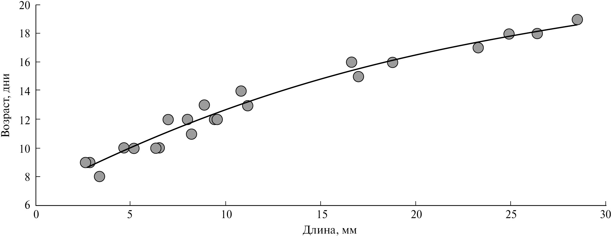 Соответственно, возраст эмбрионов по известной длине можно определить с помощью обратной функции (рис. 4):