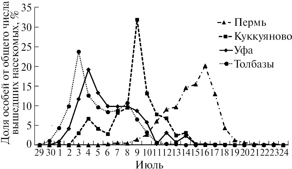 Выход молей более северных популяций Ph. issikii г. Уфы, с. Куккуяново и г. Перми наблюдали позднее, в период с 1 по 17 июля (с максимумом 4 июля), с 3 по 18 июля (с максимумом 9 июля) и с 6 по 23 июля (с максимумом 16 июля) соответственно. Появление паразитоидов липовой моли-пестрянки башкирских популяций Ph. issikii (Толбазы, Уфа, Куккуяново) происходило со 2 по 18 июля (с максимумом 12 июля), а пермской популяции – с 9 по 19 июля (с максимумом 15 июля) (рис. 4).