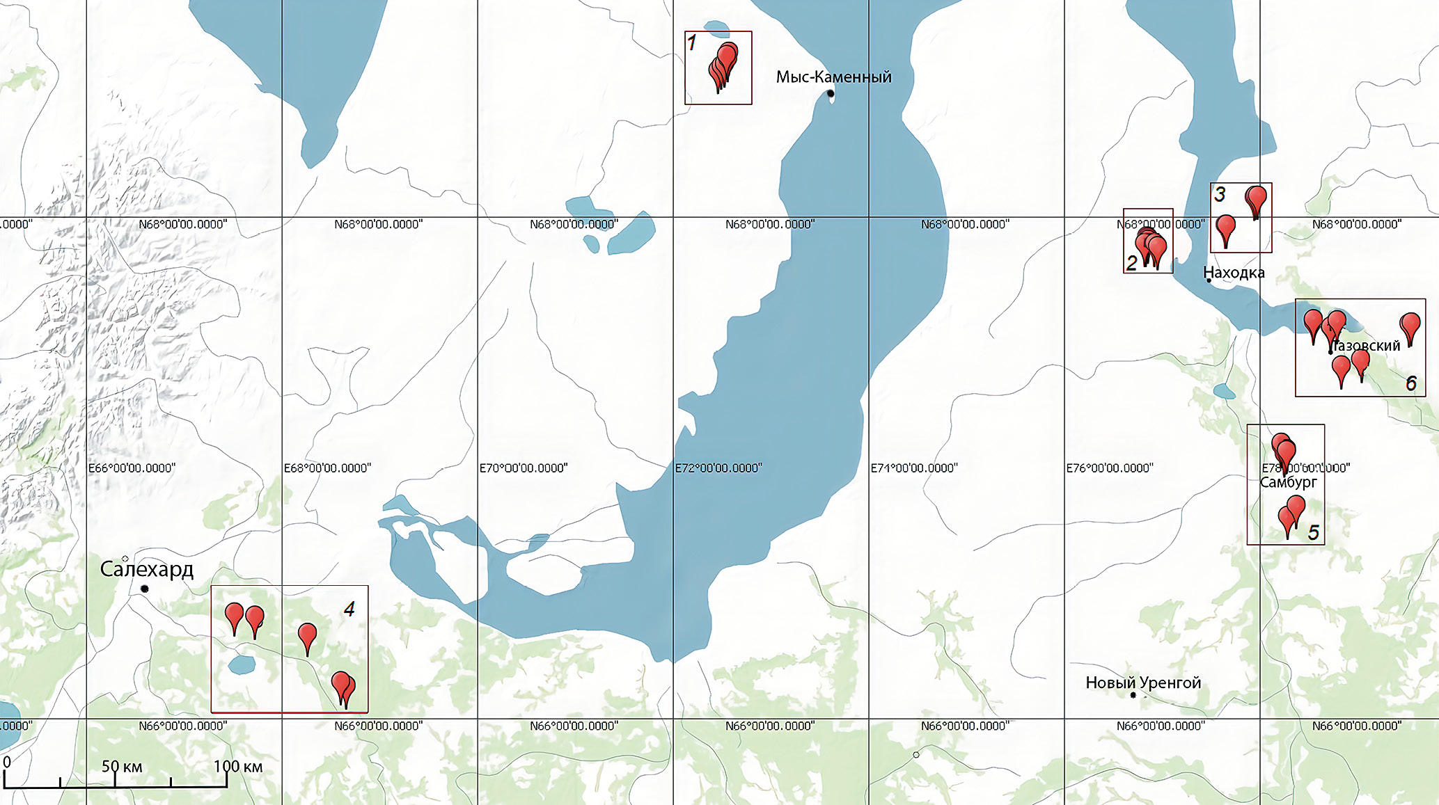 Губки развиваются на твердых субстратах различного происхождения и являются типичными перифитонными организмами (Резвой, 1936; Протасов, 1994). Изучение зооперифитона Субарктики проводили в зоне южной тундры (2001–2002 гг.) и лесотундры (2013–2016 гг.) в конце июля–первой половине августа на территории Ямало-Ненецкого автономного округа. В обеих зонах пробы условно разделили на три участка – западный, центральный и восточный (рис. 1).