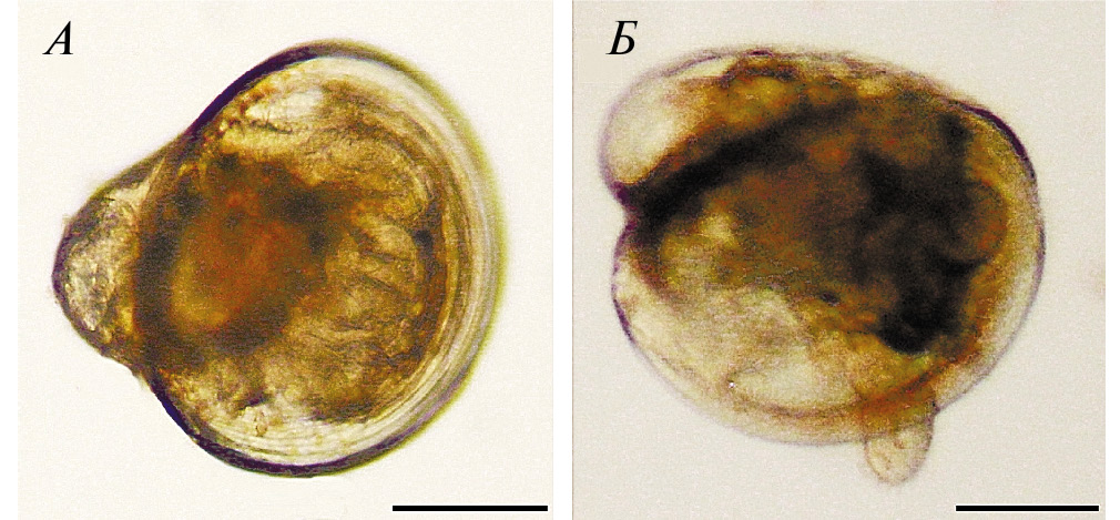 Рис. 2. Личинки устрицы Crassostrea gigas из планктона: А – великонха, Б – педивелигер. Масштаб 100 мкм.