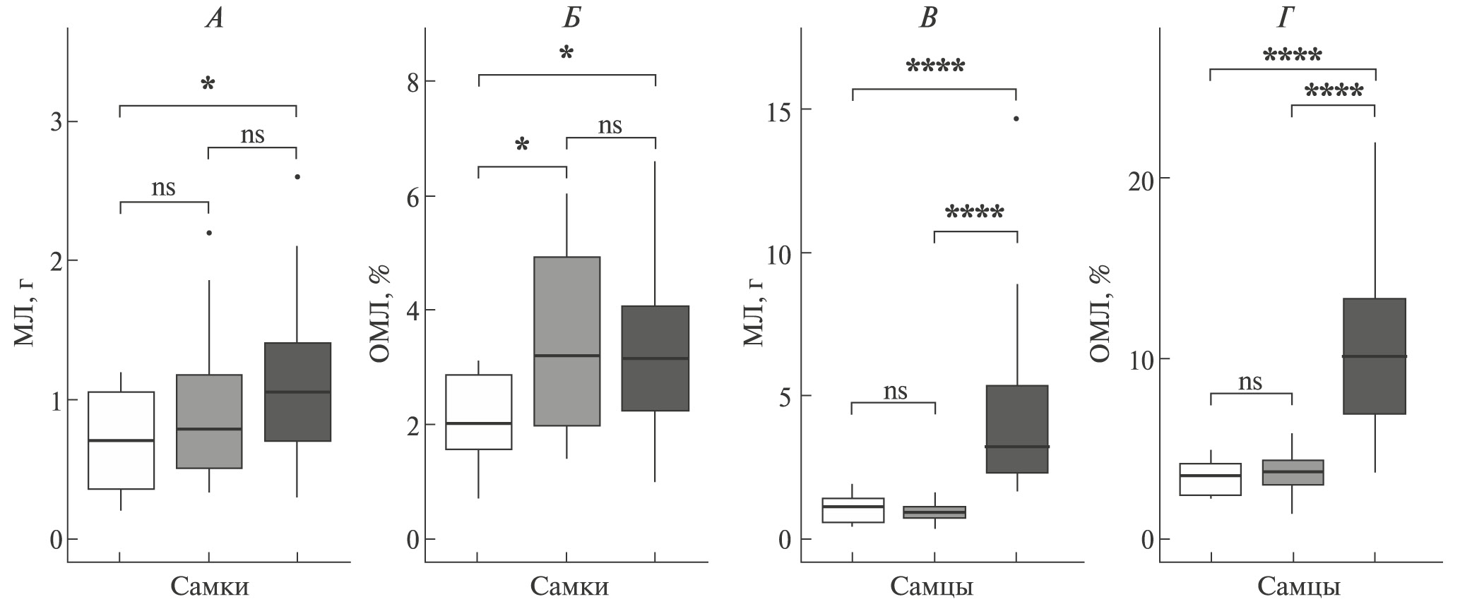 Рис. 1. Сезонная изменчивость массы лимфы в подкожных лимфатических синусах (МЛ, г) и относительной ее массы (ОМЛ, %) у самок и самцов травяной лягушки. Белые боксплоты – осень, светло-серые – зима, темносерые – весна. Высота боксплотов – границы 25–75% значений в выборке, горизонтальные линии внутри боксплотов – медианные значения, концы вертикальных “усов” – минимальные и максимальные значения, точки – выбросы. Концы скобок указывают на сравниваемые выборки; над скобками приведена значимость различий: * p ≤ 0.05, **** p < 0.0001, ns – нет различий.