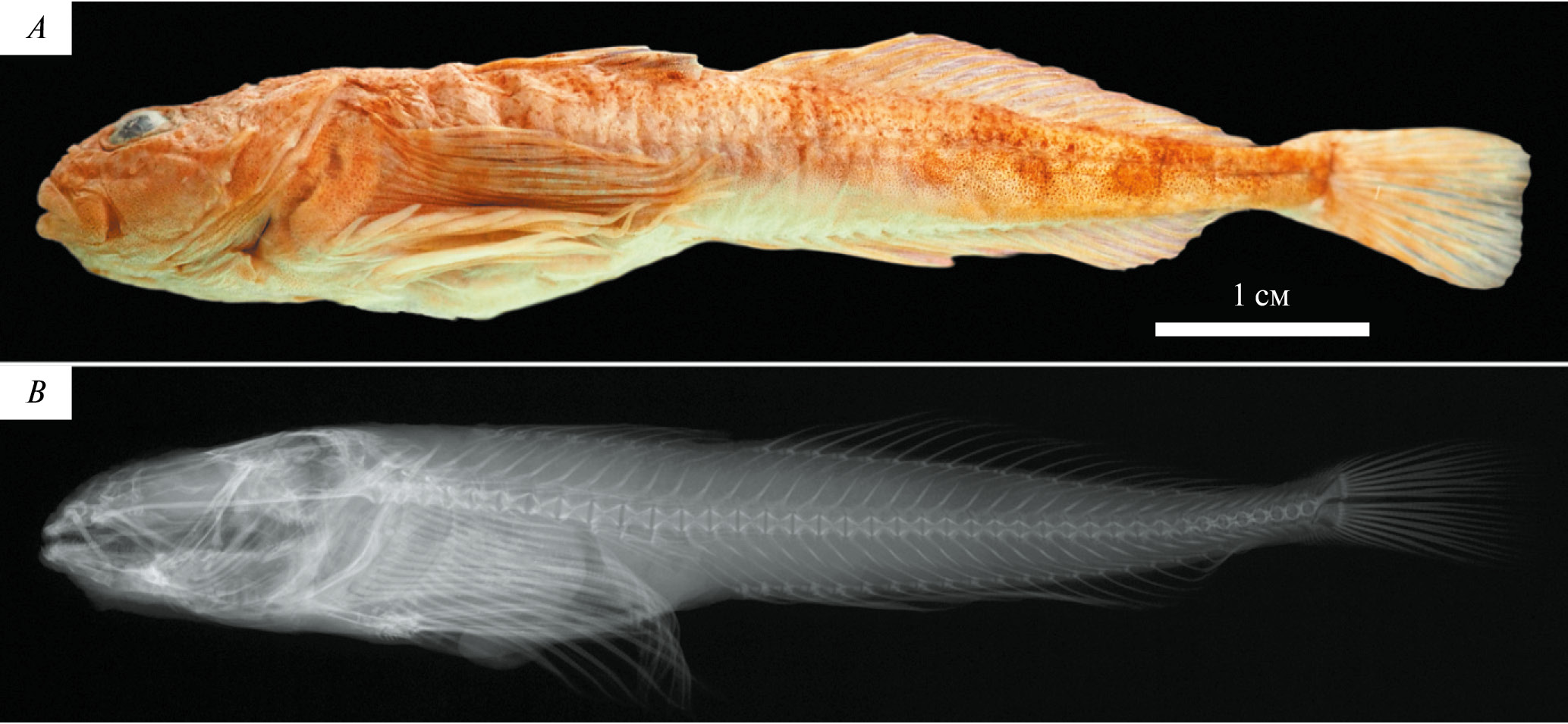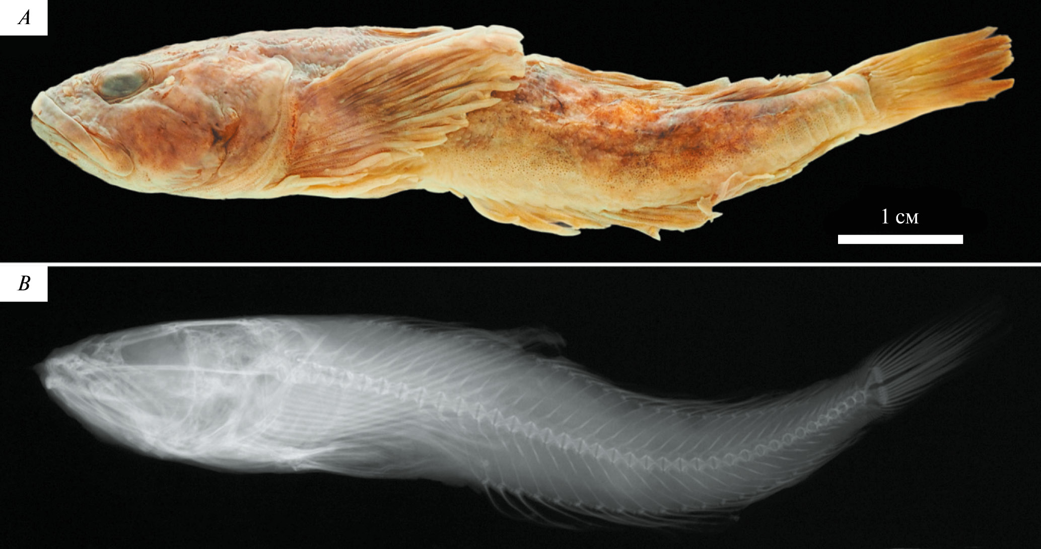 Рис. 2. Сottus kesslerii Dybowsky (современное название Leocottus kesslerii) – синтип (BMNH 1897.7.5.5), оз. Байкал. А – общий вид, фотография; В – осевой скелет, рентгенограмма.
