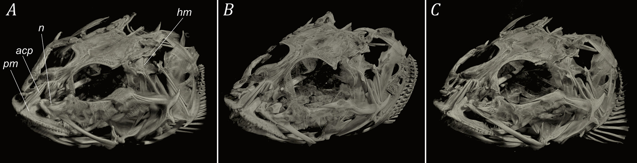 Рис. 7. Томограммы головы особей L. kesslerii из трех озер: А – Байкал, В – Арахлей, С – Гусиное. Обозначения костей (по: Yabe, 1985): pm – предчелюстная кость, acp – восходящий отросток предчелюстной кости, n – носовая кость, hm – гиомандибула.