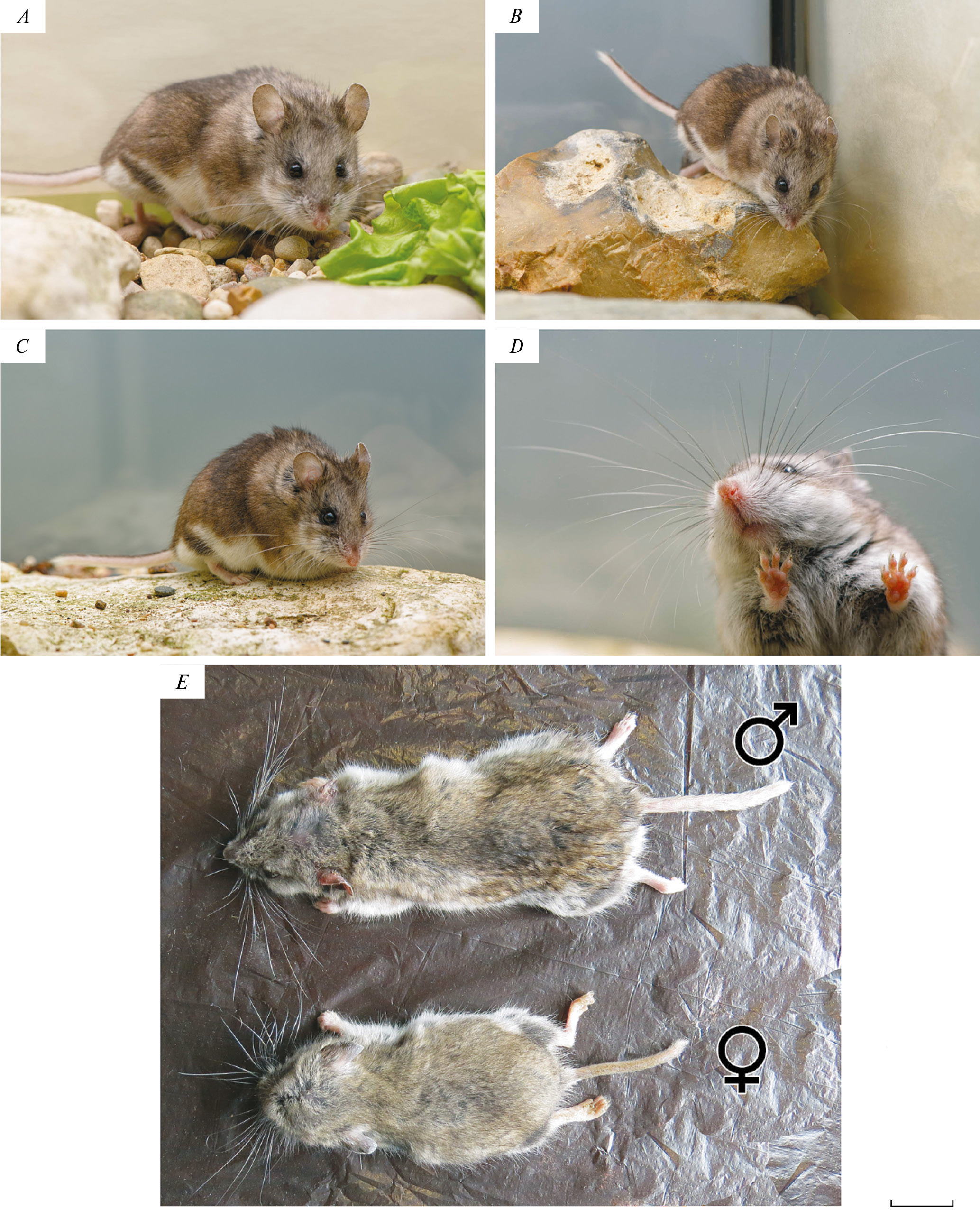 Рис. 1. Внешний вид взрослых особей Urocricetus kamensis: A–D – самка в условиях вивария ИПЭЭ РАН (D – фотоснимок через стекло вольера, хорошо различимы крупные подошвенные мозоли кисти); E – тушки изученных особей. Масштаб 10 мм. Фото А. В. Сурова.