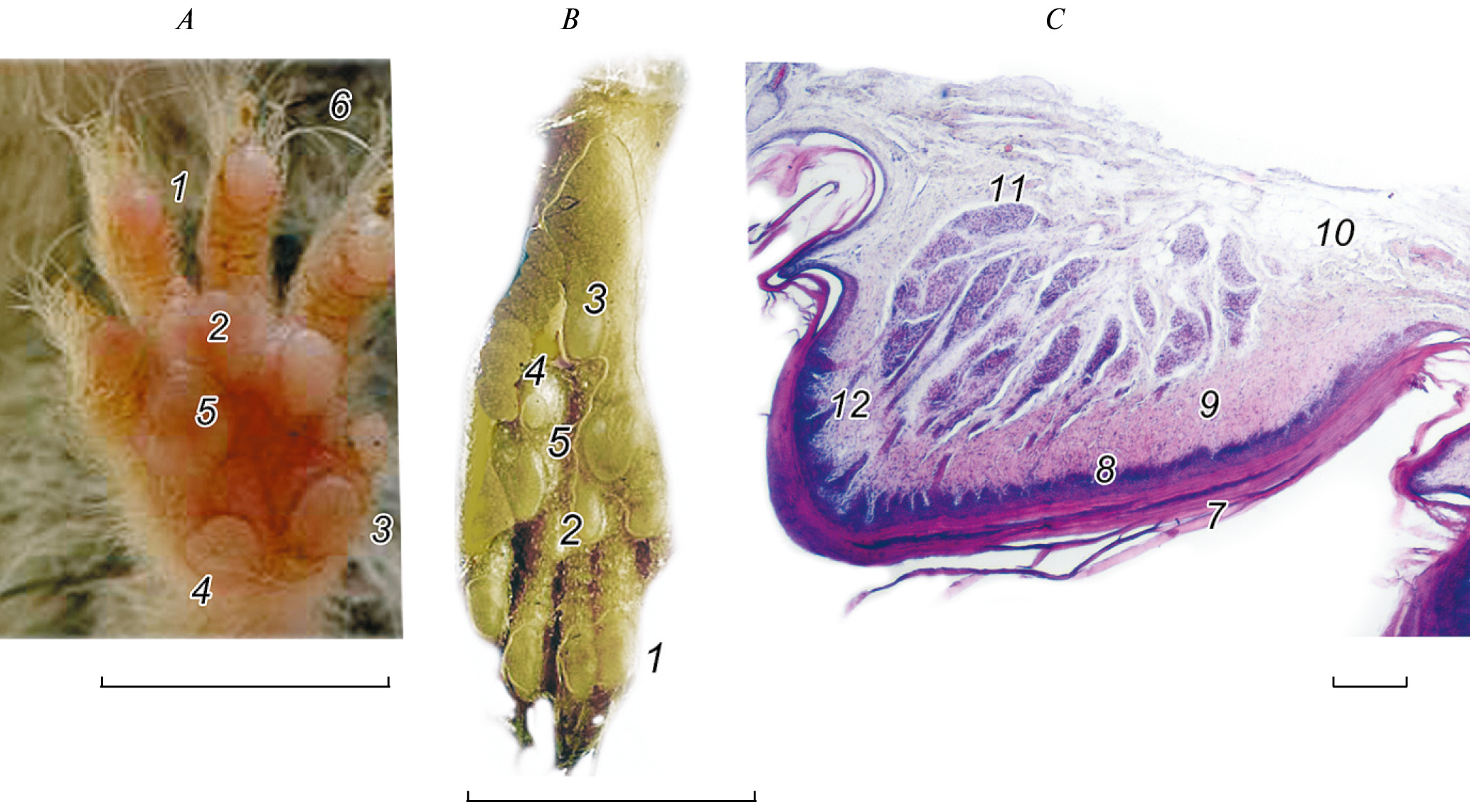 Рис. 5. Расположение и микроструктура подошвенных мозолей у взрослой самки Urocricetus kamensis. A – волярная поверхность кисти; B – плантарная поверхность стопы; C – продольное сечение подошвенной мозоли кисти, окраска гематоксилин-эозином. Мозоли: 1 – пальцевые; 2 – метакарпальные/метатарзальные; 3 – тенар; 4 – гипотенар; 5 – центральная; 6 – волос; 7 – роговой слой; 8 – сосочковидный эпидермис; 9 – дерма; 10 – подкожная жировая клетчатка; 11 – эккриновая железа; 12 – проток эккриновой железы. Микрофото. Масштаб: A, B – 10 мм; С – 100 мкм.
