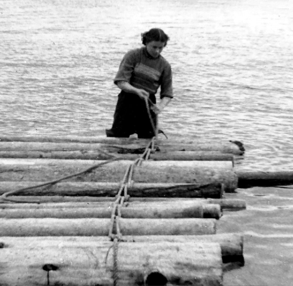 Беломорский стройотряд. Галина Клевезаль вяжет плот. Многие здания ББС были построены из плавника.