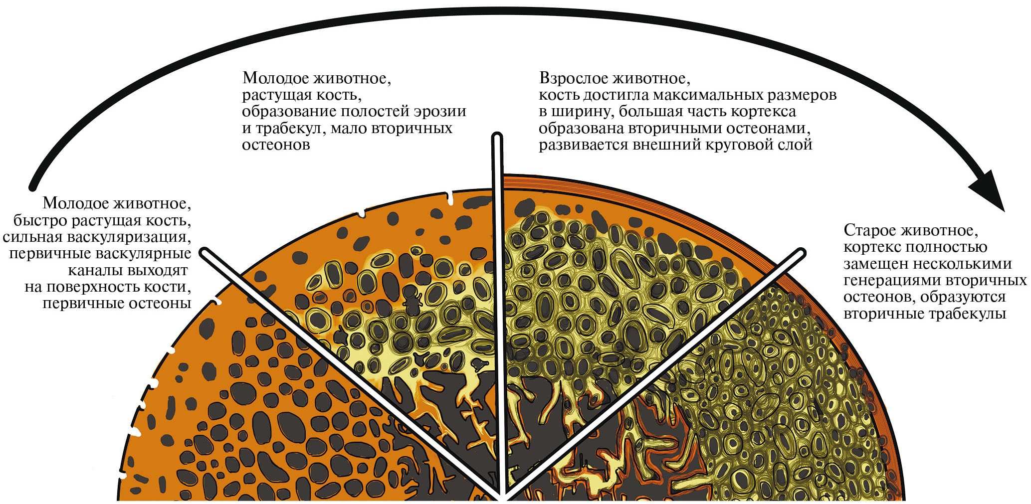 Рис. 3. Схема онтогенетических изменений в костях конечностей тетрапод, связанных со вторичным ремоделингом.