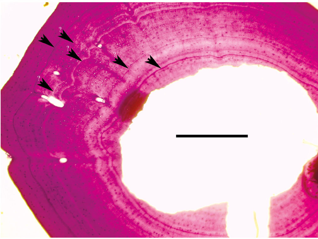 Рис. 1. Пример дополнительных LAGs на срезе кости голени (4 такие линии отмечены стрелками со знаком вопроса), которые могут быть неотличимы от LAGs, соответствующих зимовкам (отмечены стрелками): двухгодовалая озерная лягушка из камчатской популяции с длительным периодом активности в течение годового цикла. Длина отрезка 1 мм.