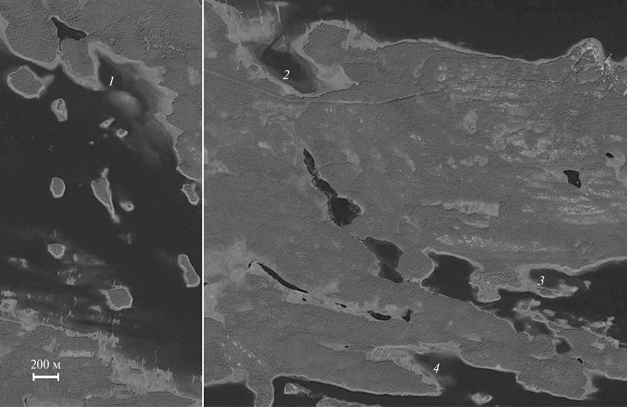 Рис. 1. Карта-схема района исследования: 1 – лагуна возле озера Трехцветное; 2 – лагуна Ермолинской губы; 3 – лагуна, расположенная на выходе из кутовой области Кислой губы; 4 – лагуна губы Барсучья