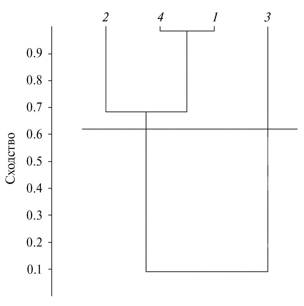 Рис. 2. Дендрограмма сходства сообществ макробентоса по плотности макробентоса (индекс Пианки) в исследованных лагунах: 1 – лагуна возле озера Трехцветное; 2 – лагуна Ермолинской губы; 3 – лагуна, расположенная на выходе из кутовой области Кислой губы; 4 – лагуна губы Барсучья. Горизонтальной линией показан уровень значимого сходства