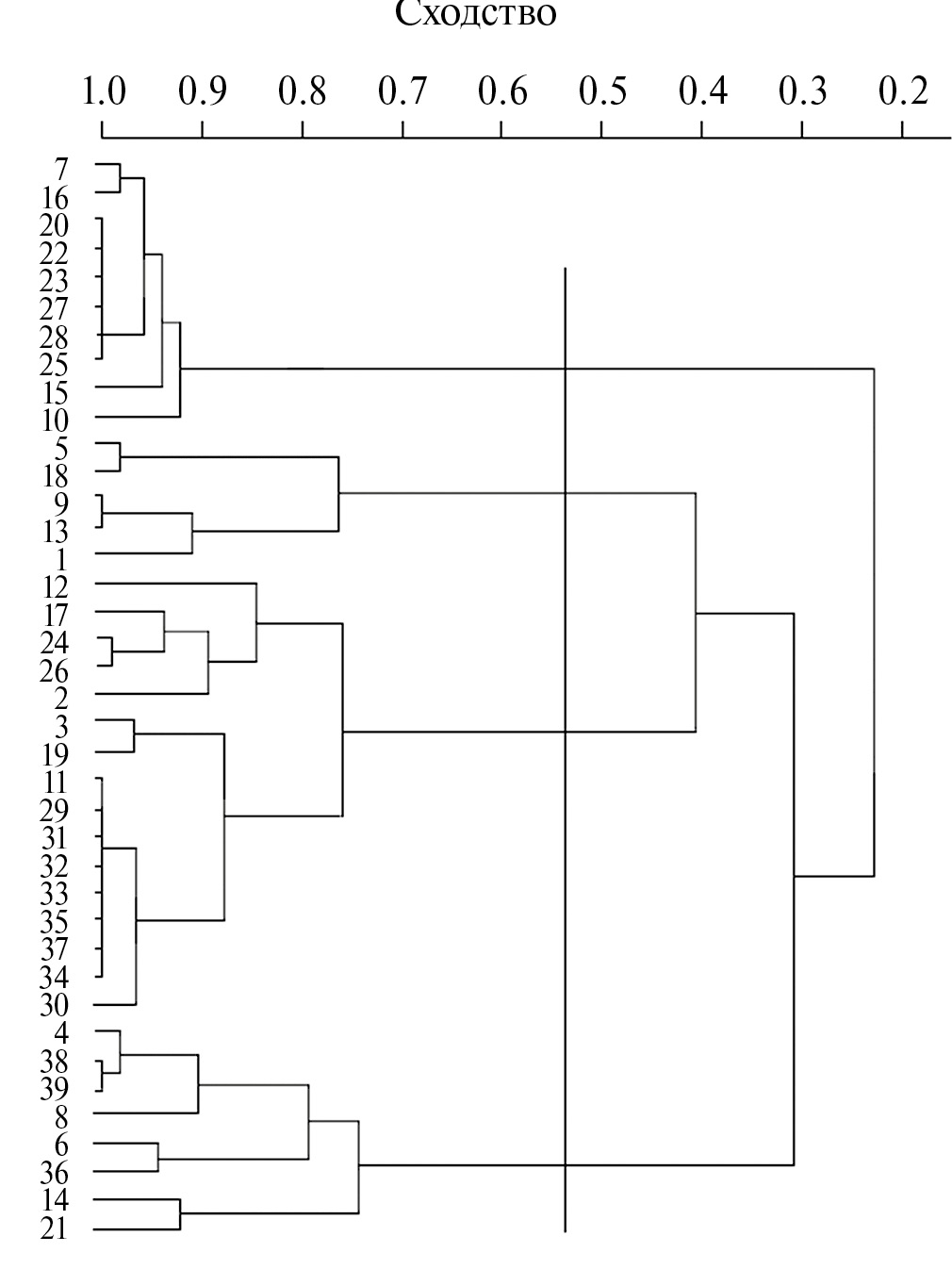 Рис. 3. Дендрограмма сходства видов по плотности популяций макробентоса (индекс Пианки) в исследованных лагунах: 1 – Mytilus edulis, 2 – Phyllodoce maculata, 3 – Amphiporus lactifloreus, 4 – Chironomus salinarius, 5 – Jaera albifrons, 6 – Peringia ulvae, 7 – Nereimyra punctata, 8 – Littorina littorea, 9 – Micronephthys minuta, 10 – Pontoporeia femorata, 11 – Tubificoides benedii, 12 – Terebellides stroemi, 13 – Scoloplos armiger, 14 – Macoma balthica, 15 – Diastylis scorpioides, 16 – Gammarus duebeni, 17 – Crassicorophium bonellii, 18 – Halicryptus spinulosus, 19 – Cladotanytarsus mancus, 20 – Caprella linearis, 21 – Atylus carinatus, 22 – Asterias rubens, 23 – Lineus gesserensis, 24 – Harmothoe imbricata, 25 – Pholoe assimilis, 26 – Ampharete acutifrons, 27 – Musculus discors, 28 – Lacuna vincta, 29 – Saccoglossus mereschkowskii, 30 – Pygospio elegans, 31 – Arenicola marina, 32 – Cylichna alba, 33 – Fabricia sabella, 34 – Onoba aculeus, 35 – Molgula griffithsii, 36 – Pectinaria koreni, 37 – Priapulus caudatus, 38 – Orthocladius saxicola, 39 – Marenzelleria arctia. Вертикальной линией показан уровень значимого сходства