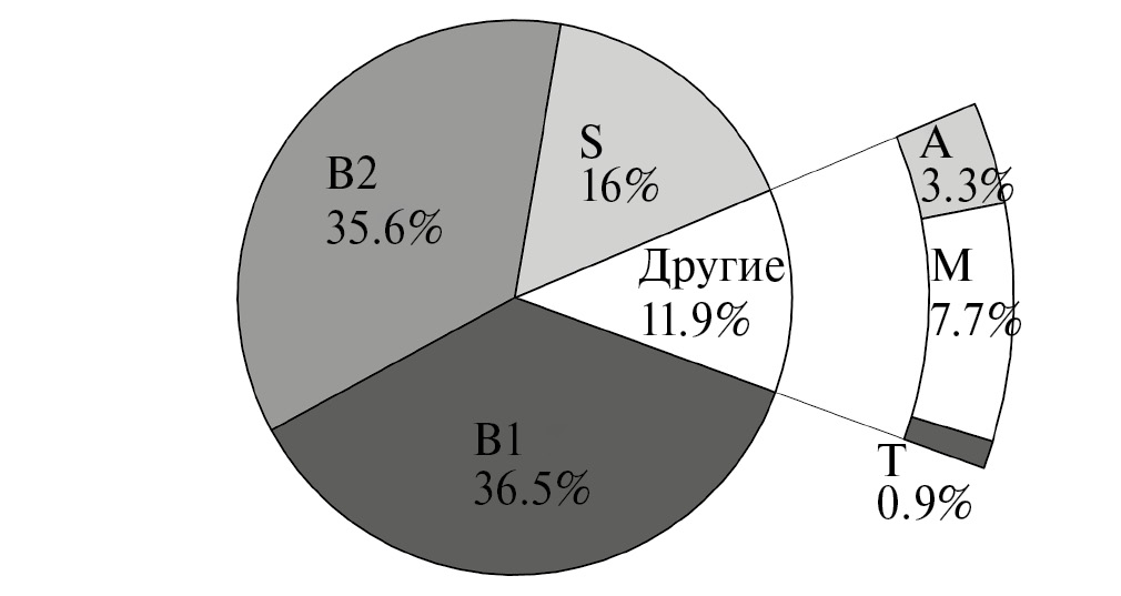Рис. 2. Соотношение морф D. villosus из реки Кубань (n = 1011): B1 – дорсальная с широкими полосами, B2 – дорсальная с тонкими полосами, S – пятнистая, M – меланиновая, A – янтарная, T – морфа с поперечными полосами