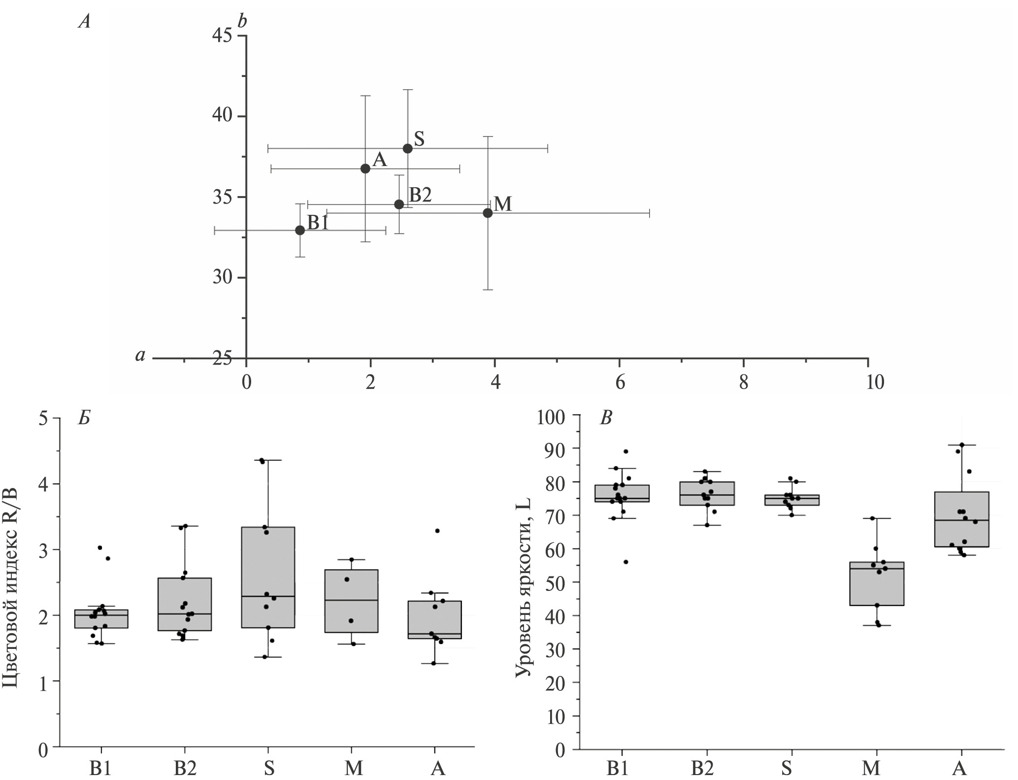 Индекс a обозначает положение цвета в диапазоне от зеленого до красного, индекс b – положение цвета от синего до желтого, диапазон значений для этих двух индексов в программе Photoshop может составлять от –128 до 127. При этом различий между морфами по индексам a и b не обнаружено (p > 0.05) (рис. 3А), попарные сравнения также не показали статистически достоверных различий. Среднее значение индекса a в среднем по всем морфам в совокупности составило 2.2 ± 5.9, причем значения находились в промежутке от –9 до 16. Наибольшее среднее значение имела морфа M (3.9 ± 7.8), а наименьшее – морфа B1 (0.9 ± 5.3). Индекс b в среднем по всем морфам составил 35.1 ± 10.9 и находился в диапазоне от 14 до 71. Наибольшее значение было у морфы S (38 ± 11.5), наименьшее – у морфы B1 (32.9 ± 6.2).