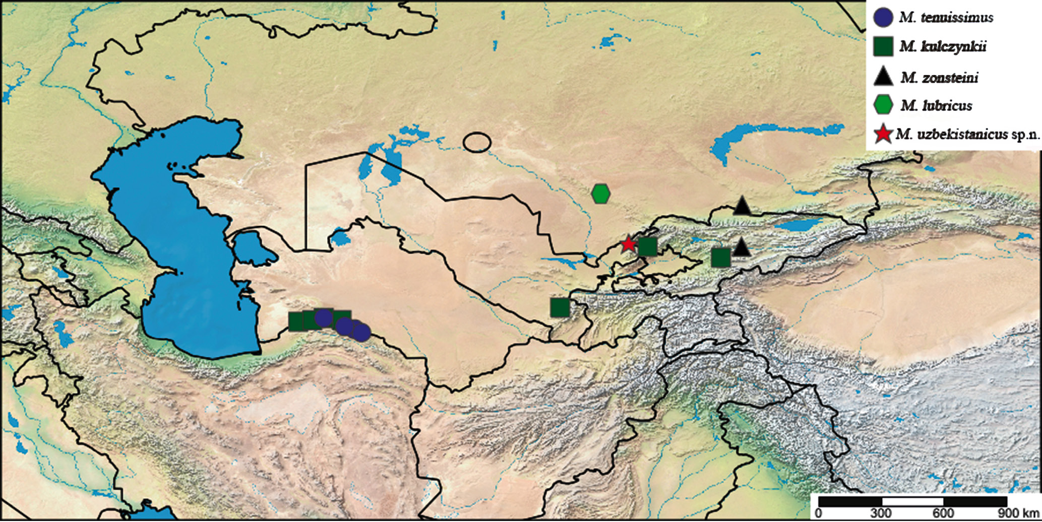 The genus Mesiotelus includes 20 species and is found from the Canary Islands to China, in the southern part of the Palearctic (WSC, 2024). One species, Mesiotelus pococki Caporiacco 1949, is described from Kenya, but its taxonomic validity is questionable (Marusik, Guseinov, 2003). The greatest species diversity of this genus (9 species) is recorded in Southern Europe (Nentwig et al., 2024). Earlier, four Mesiotelus species were known from the Middle Asia: M. kulczynskii Charitonov 1946, M. tenuissimus (L. Koch 1866), M. zonsteini Mikhailov 1986 and M. lubricus (Simon 1880) (Fig. 1). All representatives of this genus found in Middle Asia live in mountainous and foothill areas (Kharitonov, 1946; Zonstein, 1984; Mikhailov, 1986; Mikhailov, Fet, 1986; Abdurasulova, 2014). The aim of the present work is to describe a new species and provide an identification key for Middle Asia and Iran Mesiotelus species.
