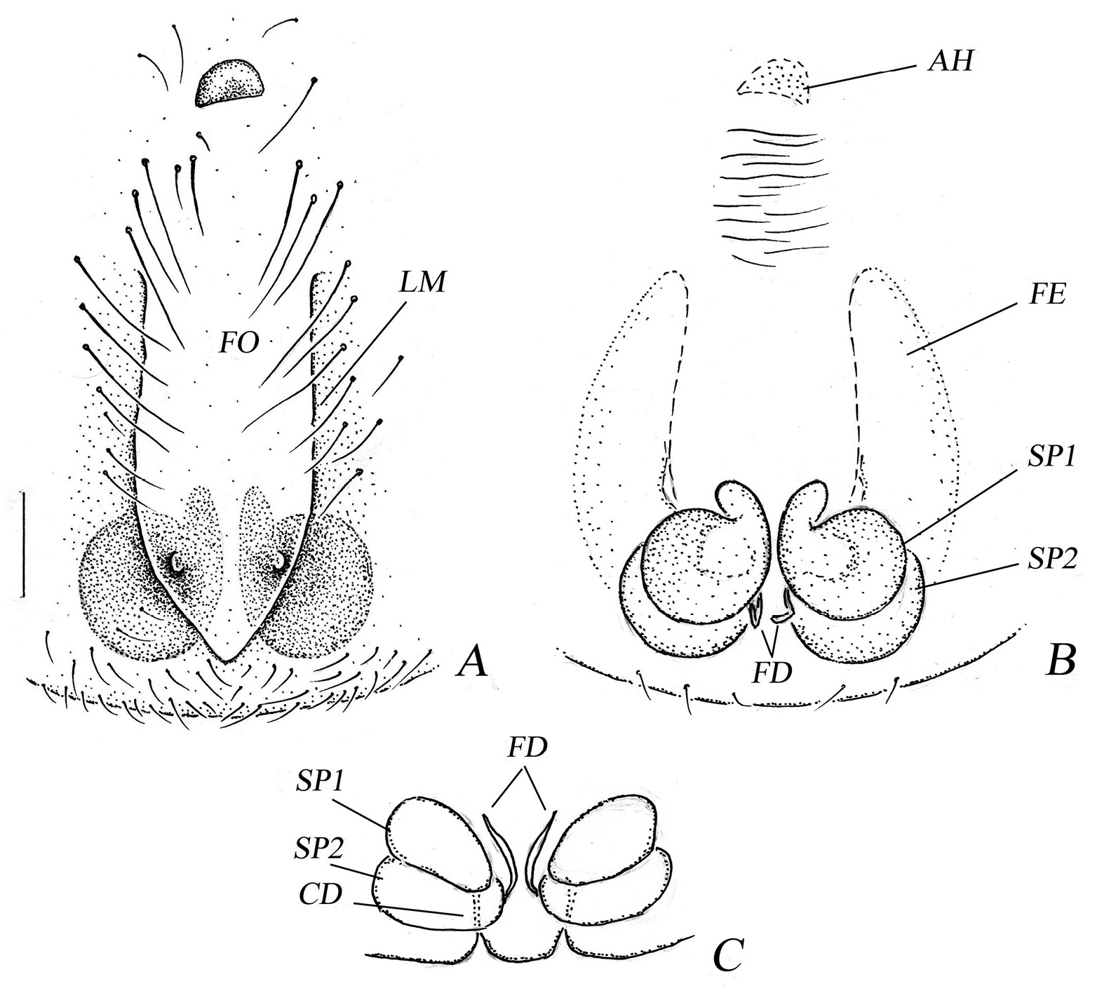 Description. Holotype female. Measurements. Total length 4.48. Carapace 1.73 long, 1.33 wide; width/length ratio 0.77. Clypeal height 0.05. Chelicera 0.73 long. Abdomen 2.75 long, 1.75 width. Coloration: carapace light yellow; chelicerae light brown, labium and endites light brown, with distal-apical light yellow swellings; legs light yellow. Abdomen grey, without a pattern. Eyes field light brown. Medial eyes field trapezoidal: length 0.21–0.27, width 0.29. Eye sizes and measurements: AME0.07, ALE0.11, PLE0.11, PME0.08, AER width 0.43, PER width 0.57. Eyes of the anterior row are slightly separated from each other: ALE-AME0.01, AME-AME0.01. Eyes of the posterior row are separated from each other: PLE-PME0.04, PME-PME0.10. Posterior medial eyes light. Leg measurements (II, IV absent): I 5.53 (1.63, 2.05, 1.10, 0.75), III 4.40 (1.30, 1.50, 0.93, 0.68). Leg spination: Femur I d1–0–2; III d1–0–1, pl and rl 0–0–1. Tibia I v 2–2–0, and many smaller, in dense rows; III pl and rl 1–1–0, v 2–2–2, and many smaller, in dense rows. Metatarsus I v 2–0–0, and many smaller, in dense rows; III pl and rl 1–0–2, v 2–2–3, and many smaller, in dense rows. Tarsus with hairs protruding in all directions. The epigyne is elongated, the lateral margins of epigyne fovea are parallel, only in the posterior part they merge with each other, forming the letter “V” (Fig. 2A). In the anterior part there is a small sclerotized anterior hood. The spermathecae consists of two parts: dorsally (Sp1) without fertilization duct and ventrally (Sp2) with fertilization duct (Fig. 2B, 2C). Sp1 is bean-shaped, has a narrow and a wide part. Sp2 roundish.