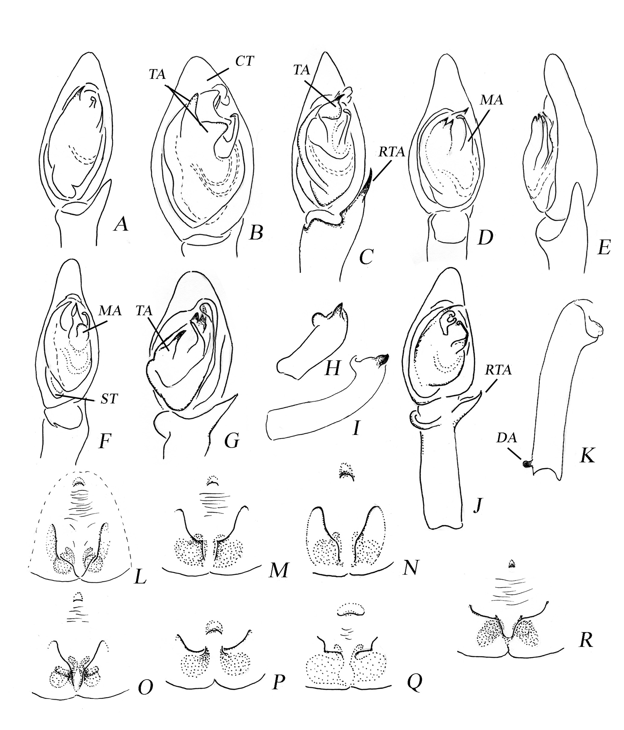 Fig. 3. Copulatory organs: A, M–M. kulczynskii Charitonov 1946; B, R M. tenuissimus (L. Koch 1866); C, KLM. lubricus (Simon 1880); DE M. patricki Zamani et Marusik 2021; F, O M. caucasicus Zamani et Marusik 2021; GH, Q M. zonsteini Mikhailov 1986; IJ, P M. khorasanicus Zamani et Marusik 2024; N M. iranicus Zamani et Marusik 2023. CT – cymbium tip, DA – dorsal apophysis, MA – median apophysis, RTA – retrolateral tibial apophysis, TA – tegular apophysis, ST – subtegulum.