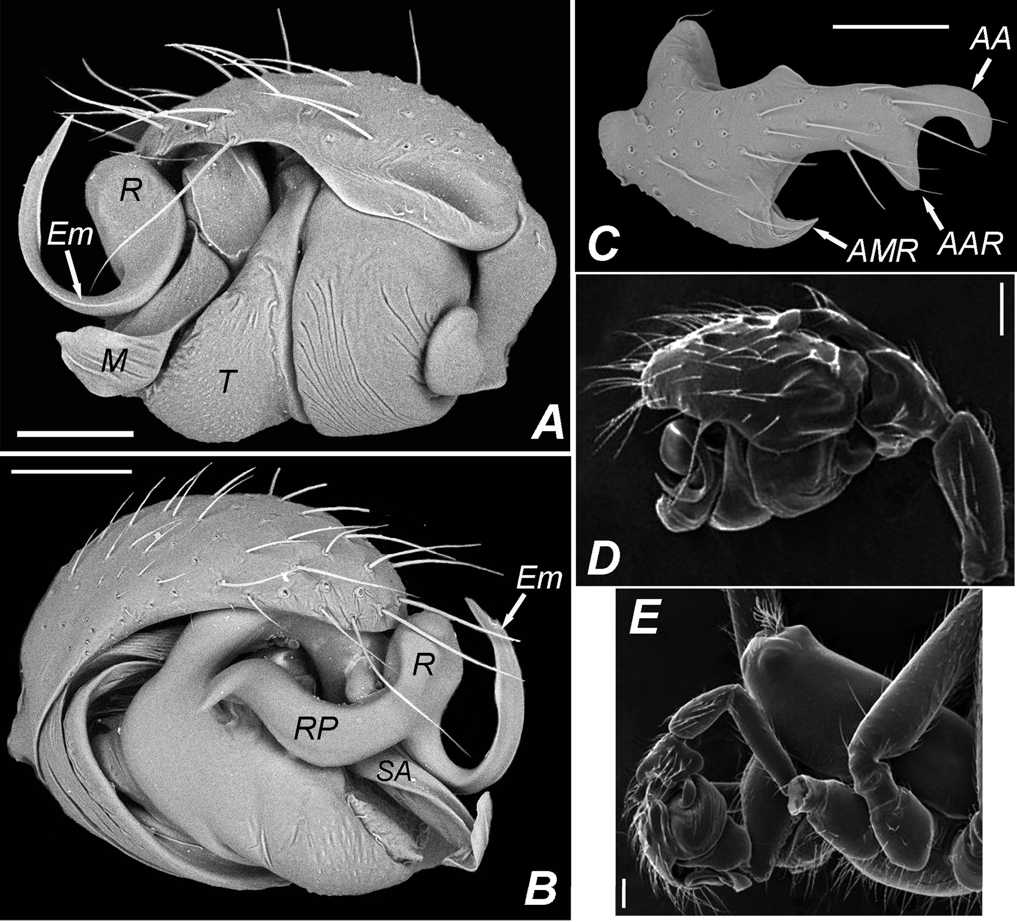 Fig. 4. Male palp of Walckenaeria danismani sp. n., scanning electron micrographs: A, D – palp, lateral views; B – same, ventral view; C – palpal tibia, dorsal view; D – bulbus, anterior view; E – carapace, lateral view (D, E after Danışman et al. (2020)); AA – anterior arm of distal apophysis, AAR – antero-retrolateral arm of distal apophysis, AMR – median-retrolateral arm of distal apophysis, Em – embolus, M – median membrane, R – radix, RP – radix part, SA – suprategular apophysis, T – tegulum. Scale bar 0.1 mm.