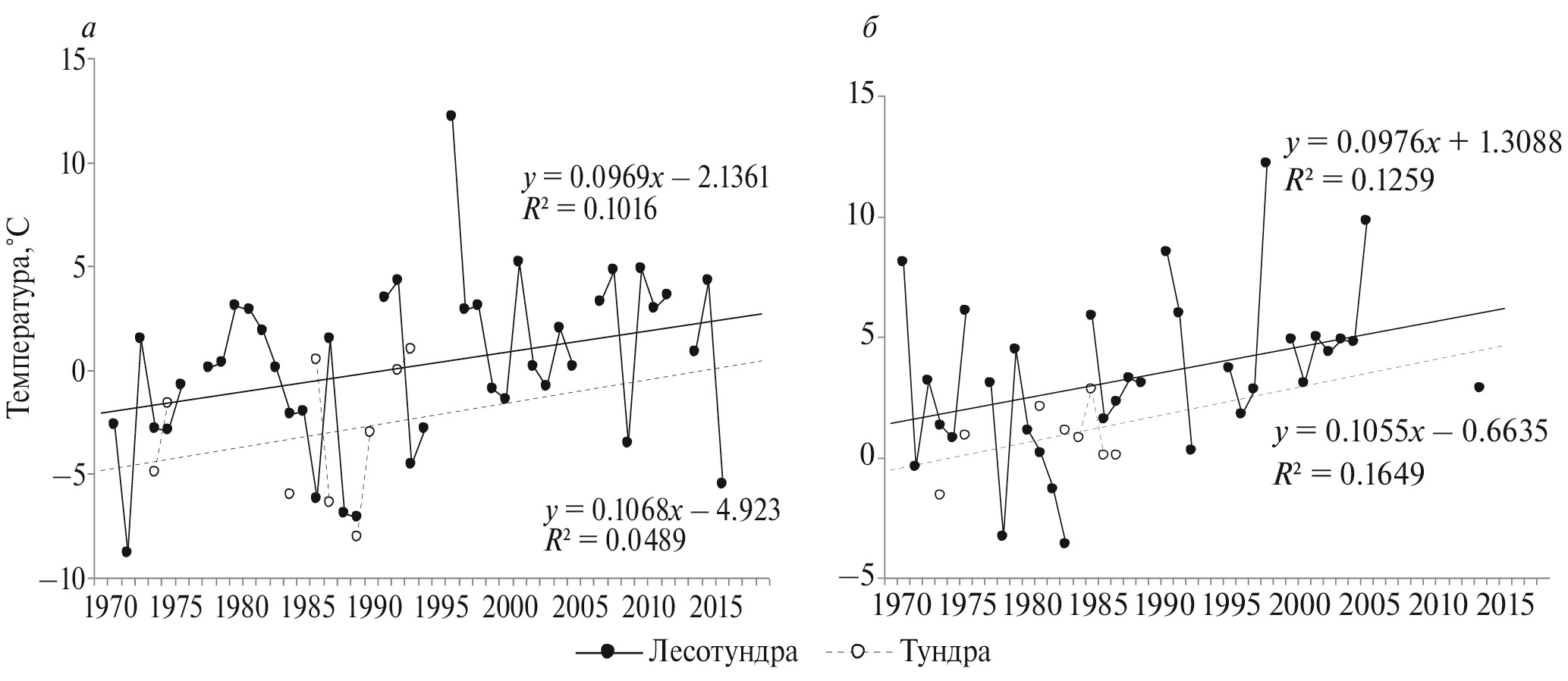 Рис. 1. Температуры прилета и многолетние тренды у белой трясогузки M. alba (а) и пеночки-веснички Ph. trochilus (б) в лесотундре и тундре Ямала.