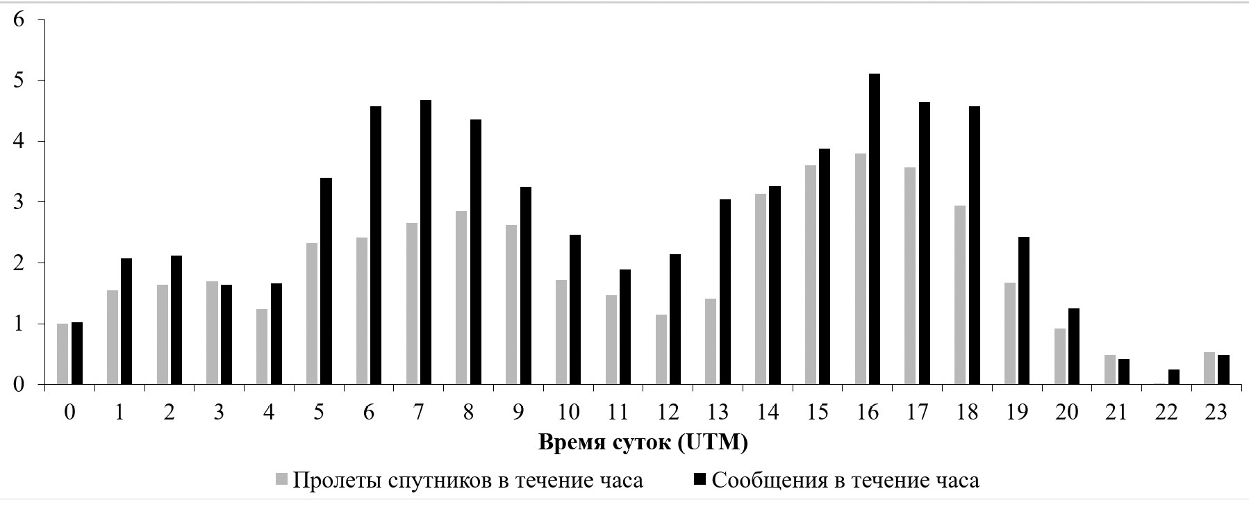 Результаты анализа демонстрируют высокую степень зависимости успешности приема сообщений от высоты траектории спутников, а также от интенсивности их появления выше 10° над линией горизонта. Анализ траекторий орбит спутников показал, что наблюдается высокая неравномерность интенсивности пролета спутников над линией горизонта на высоте, достаточной для уверенного приема сообщений. Наибольшее влия- ние эти факторы оказывают на успешность приема сообщений в период с 20:00 до 01:00 UTM, когда в течение часа на высоту более 10° над линией горизонта поднимаются от 0 до 3 спутников. При этом в этот период в течение часа три спутника имеют максимальный угол подъема над горизонтом выше 10° лишь в 2% случаев, а в 26% случаев спутники на данной высоте не наблюдаются. Следует также заметить, что 25% пролетов в этот период приходятся на инновационный французский микроспутник-демонстратор ANGELS (А1), эффективность приема сообщений которым минимальна. Поэтому, несмотря на то, что ошейник регулярно передает по 24 сообщения в течение часа, в указанный период в течение часа в среднем получено 0.74 ± 0.05 сообщений с одного действующего ошейника, то есть около 3.1% от количества переданных. Периоды наилучшего приема сообщений приходятся на временны́е промежутки с 05:00 до 10:00 и с 16:00 до 19:00 UTM. В указанные периоды только в 3.4% случаев в течение часа над горизонтом поднимался только один спутник, имеющий максимальный угол подъема более 10°, а в 57.3% случаев таких спутников наблюдалось от 4 до 8. В результате для этих временны́х промежутков характерна высокая успешность приема сообщений. В среднем в течение часа принято 4.51 ± 0.10 сообщений, около 18.8% от количества переданных ошейниками.