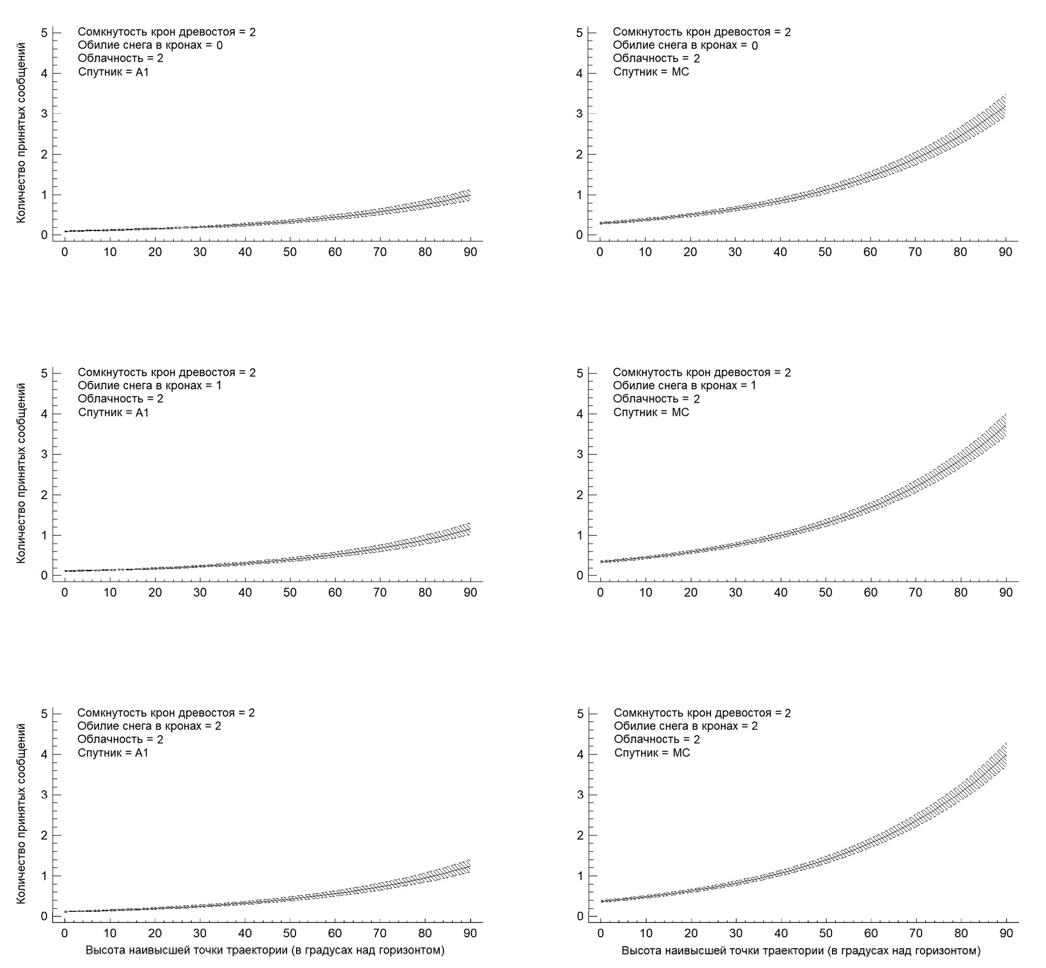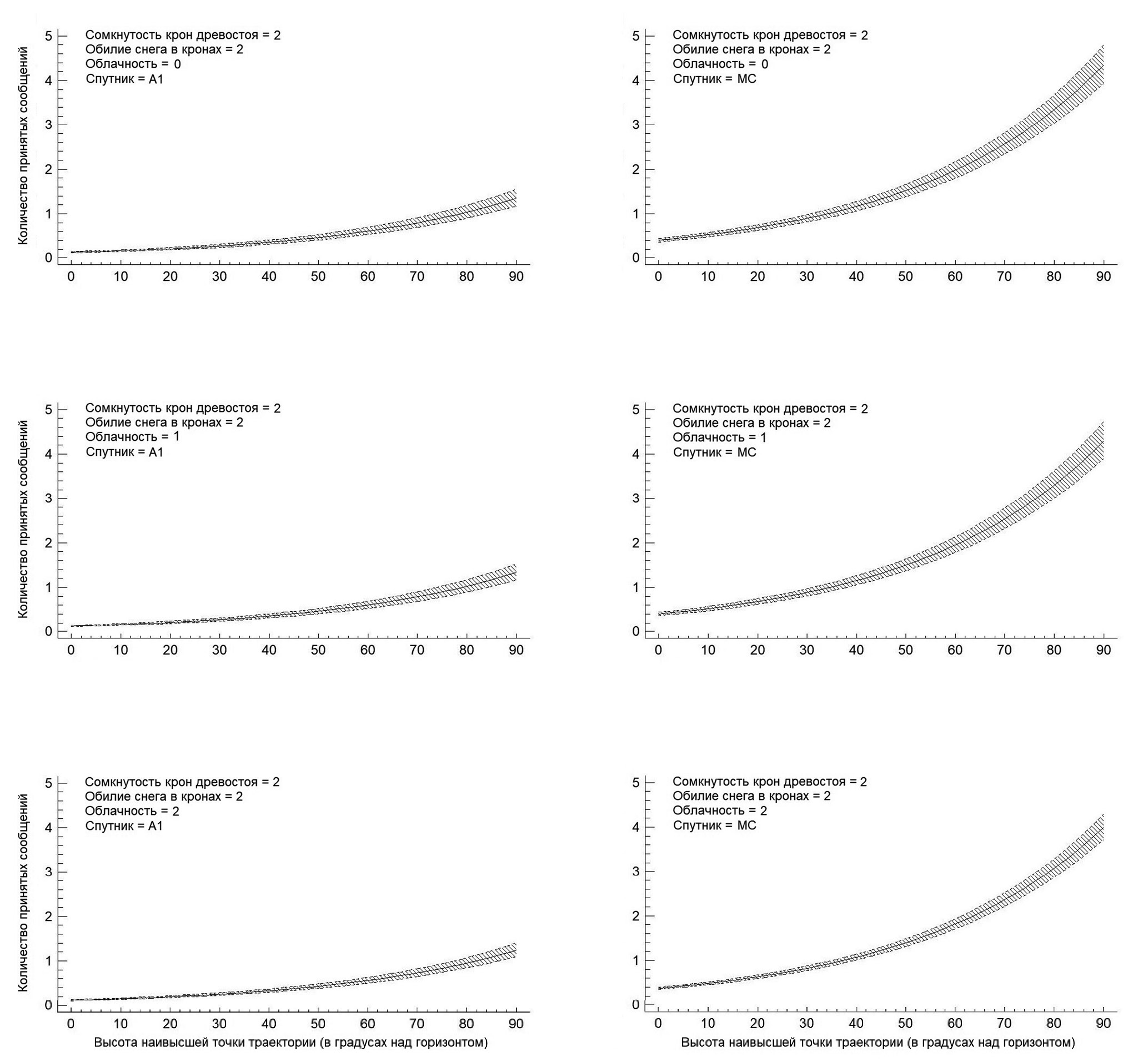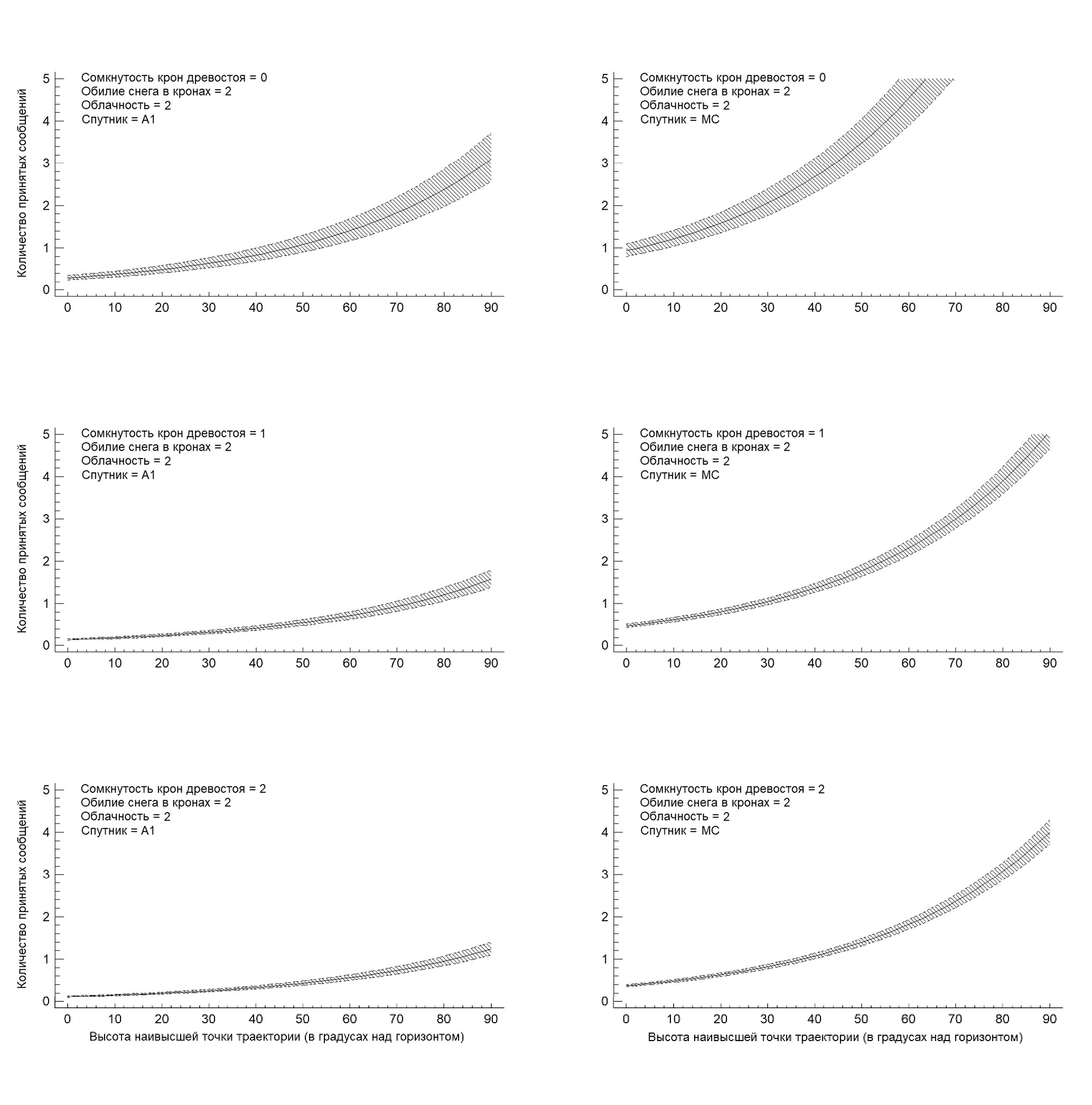 Примечания. В данной модели за стандартные условия приняты: пасмурное небо, высокая сомкнутость крон (более 30%), обильная кухта (плотные шапки снега на кронах). Отклонения в приеме сообщений разными моделями спутников указаны в сравнении с успешностью приема индийским альтиметрическим спутником SARAL (SR).