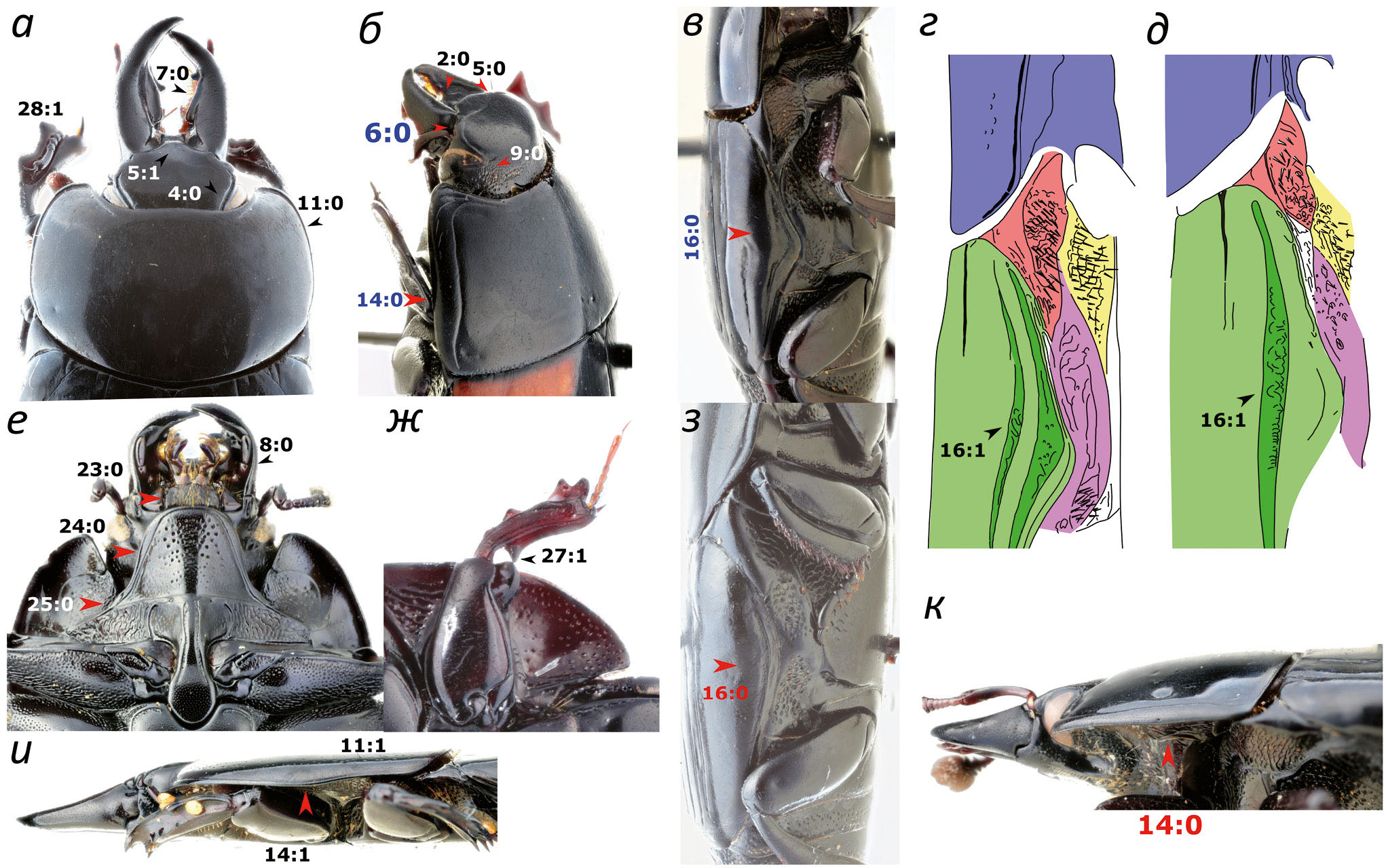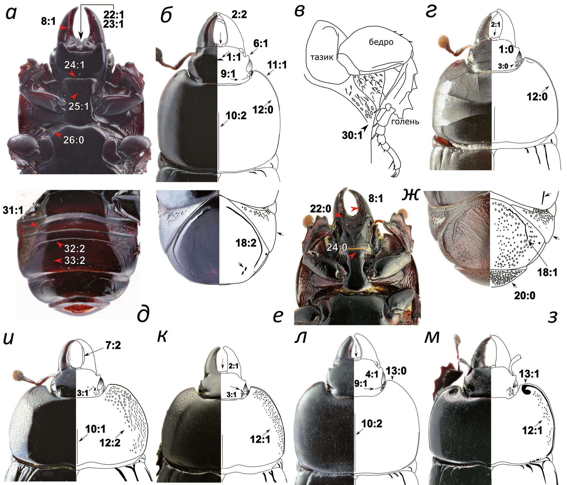 Впервые было обнаружено, что утолщение кутикулы в основании гонококситов и базальная вырезка гонококсита (рис. 10) – признаки, наличие которых характерно для P. javanus, H. quadrimaculatus и исследованных видов рода Hololepta. Вероятно, анализ состояний этих признаков может оказаться полезным для будущих реконструкций филогении Histerinae. Также было обнаружено, что у видов H. semicincta, H. indica, P. javanus и H. quadrimaculatus киль гонококсита свернут относительно слабо по сравнению с килем H. higoniae и H. plana. Место изгиба киля у данных видов отмечено на рис. 8 красным цветом. У остальных видов Hololepta край гонококсита свернут сильнее, в некоторых случаях киль свернут в виде полукольца (H. higoniae, H. plana и H. laevigata) (рис. 8).