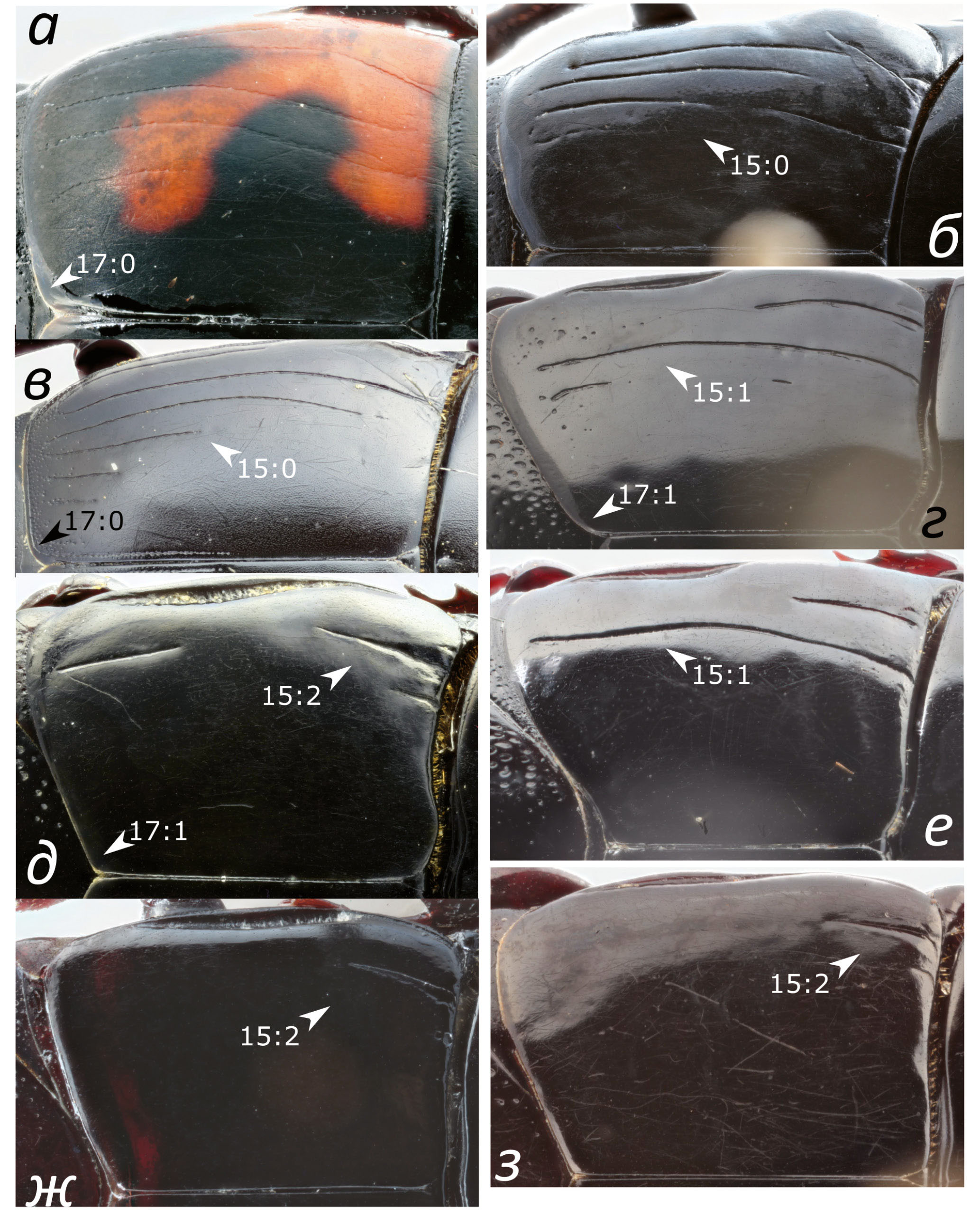 Вторая и третья группа объединены признаками – 11:1 (краевая бороздка переднеспинки тонкая, почти неразличимая) и 16:1 (плечевая вмятина надкрылий хорошо выражена). Данные группы состоят из видов подрода Hololepta.