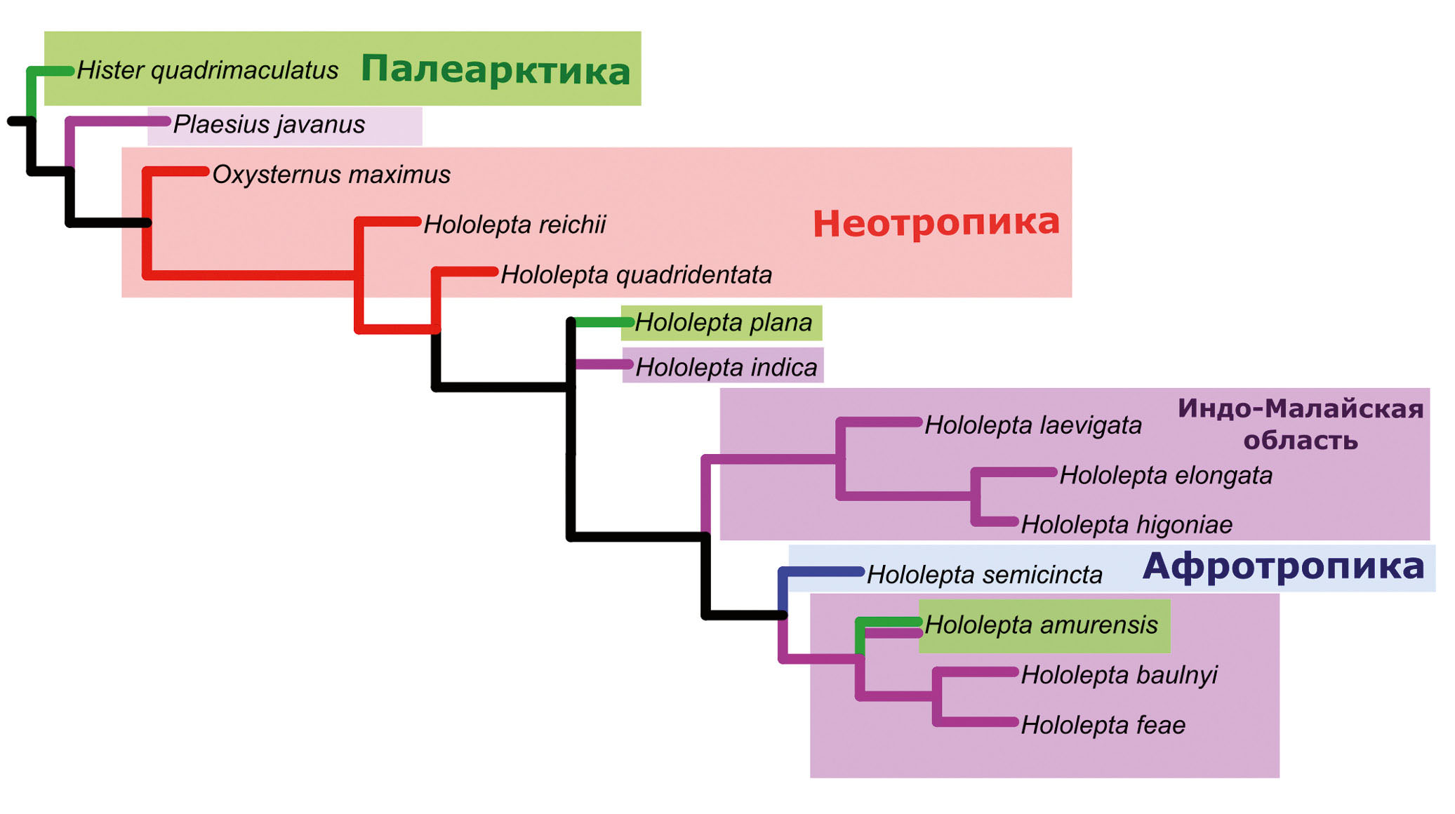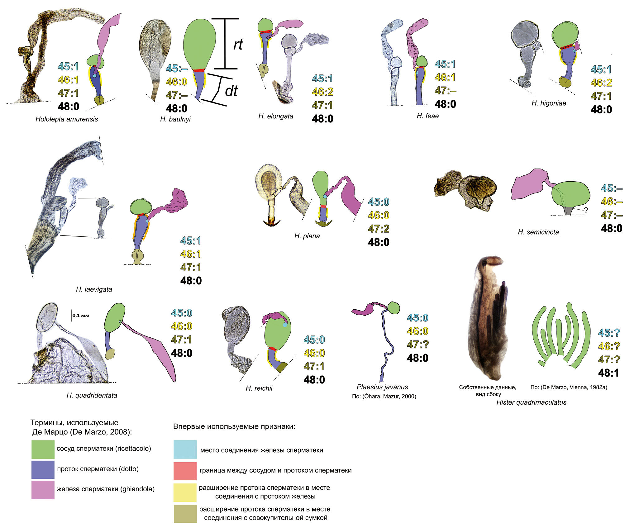 В Палеарктической области отмечено только 12 видов рода Hololepta (Lackner et al., 2015), из которых на территории России встречаются два – Hololepta plana (Sulzer 1776) и H. amurensis Reitter 1879 (Крыжановский, Рейхардт, 1976; Крыжановский, 1989). H. plana – широко распространен на территории России, а H. amurensis встречается в Приморье и на юге Хабаровского края. Для обоих этих видов строения яйцеклада до сих пор не было описано. Строение сперматеки H. plana описано в работе Де Марцо и Виенны (De Marzo, Vienna, 1982). Изображение сперматеки H. amurensis приведено в работе Охары (Ôhara, 1991).