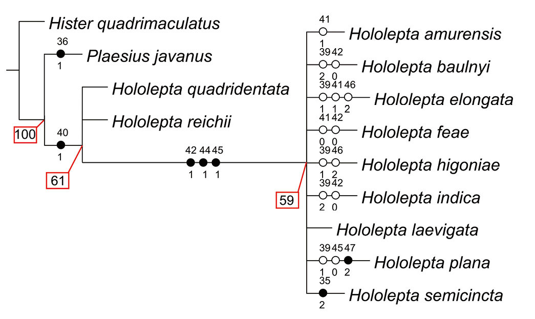 Наличие вентральной бороздки гонококсита (43:1, L = 1, RI = 100, CI = 100) и наличие изгиба края переднеспинки (14:1, L = 1, RI = 100, CI = 100) объединяют все виды подрода Hololepta, а также Hololepta (Leionota) quadridentata, но не Hololepta (Leionota) reichii. У последнего вида вентральная бороздка гонококсита не обнаружена (43:0) и край переднеспинки прямой (14:0).