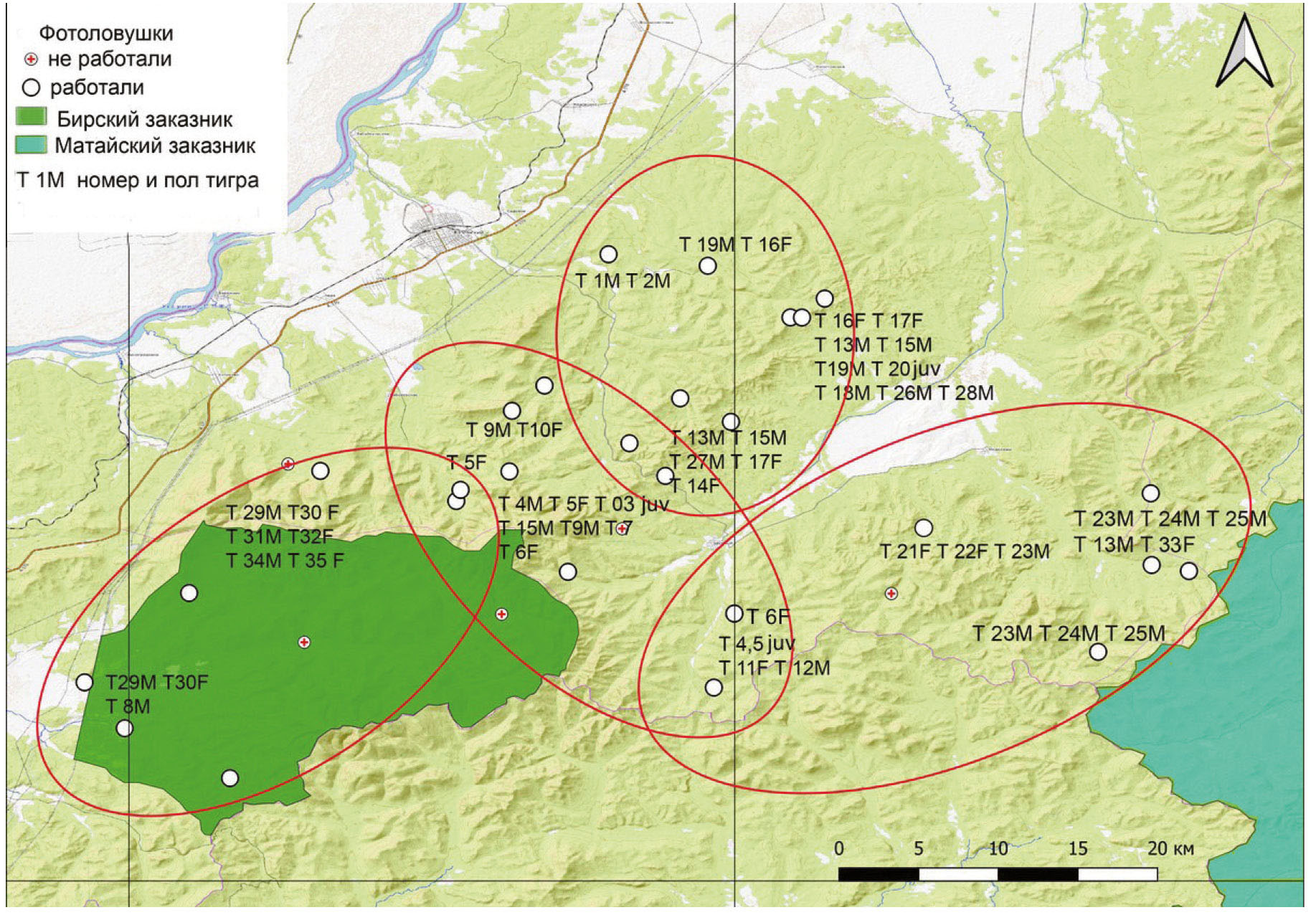 Распределение тигров на исследуемой территории неравномерно и приурочено к наиболее удаленным от населенных пунктов участкам бассейнов верхних течений рек с относительно сохранившимися массивами смешанных лесов, где хищники образуют небольшие репродуктивные ядра (рис. 3). Каждое из них включает не менее одной–трех взрослых самок репродуктивного возраста и одного–трех взрослых самцов. Здесь же могут присутствовать тигрята-сеголетки, молодые самостоятельные особи из распавшихся выводков, а также кочующие нетерриториальные звери, преимущественно самцы. Согласно нашим данным, численность животных репродуктивного возраста в популяционной группировке тигров на Вяземском участке составляет не более 18–20 особей, т. е. фактически чуть более ее половины. Именно эта часть группировки формирует пространственно-этологическую структуру популяции и определяет ее репродуктивные свойства (Лукаревский и др., 2021). Молодые тигры до возраста 20–35 месяцев обитают на территории родителей и часто регистрируются фотоловушками совместно или последовательно с интервалом один–два дня.