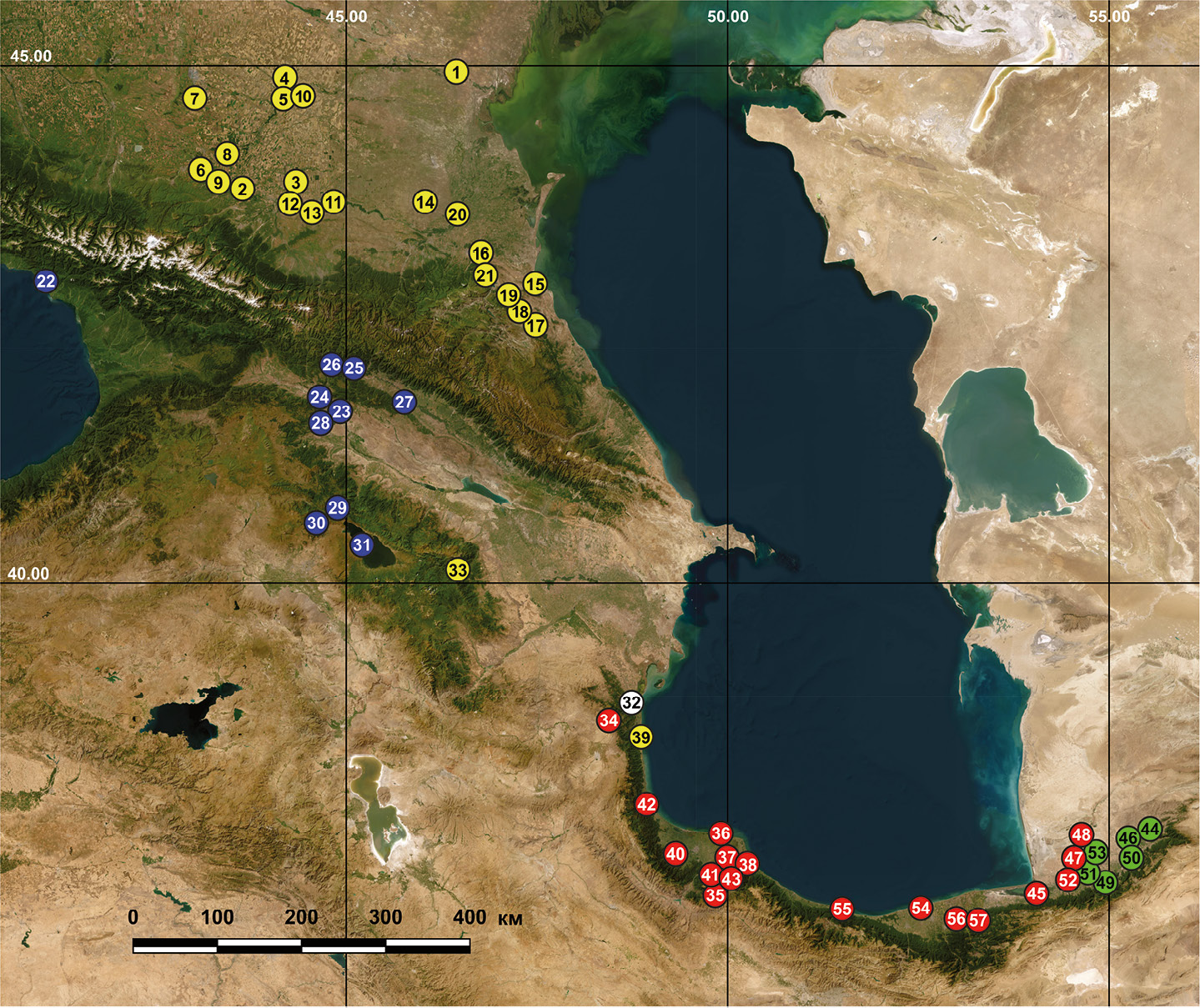 Рис. 1. Пункты сбора экземпляров Lacerta strigata, использованных для молекулярно-генетического анализа. Митохондриальные клады: А – желтые, B – синие, C – красные, D – зеленые. Белым цветом обозначен локалитет (№ 32), откуда имеется только последовательность β-fib. Нумерация и буквенные обозначения соответствуют таковым в табл. 1.
