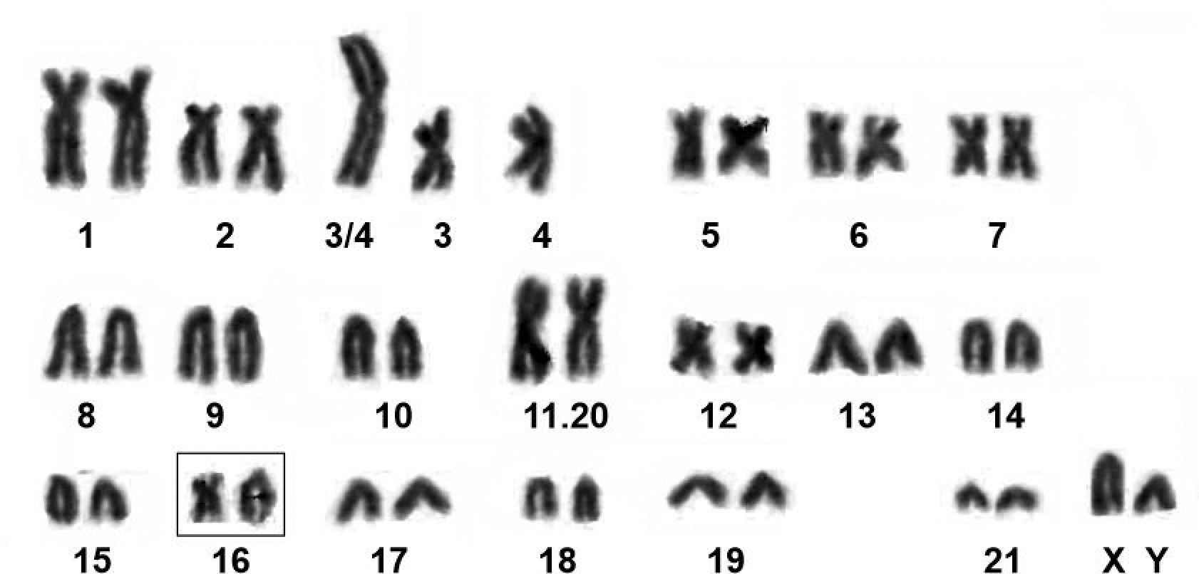 Рис. 3. Кариотип самца № 694 полевки Максимовича (Alexandromys maximowiczii), вариант 2n = 41c, NF = 59 (Хабаровская популяция) окрестности пос. Галкино (по: Картавцева и др., 2017, с измененным положением пар хромосом). В рамке гетероморфная (M/A) пара № 16.